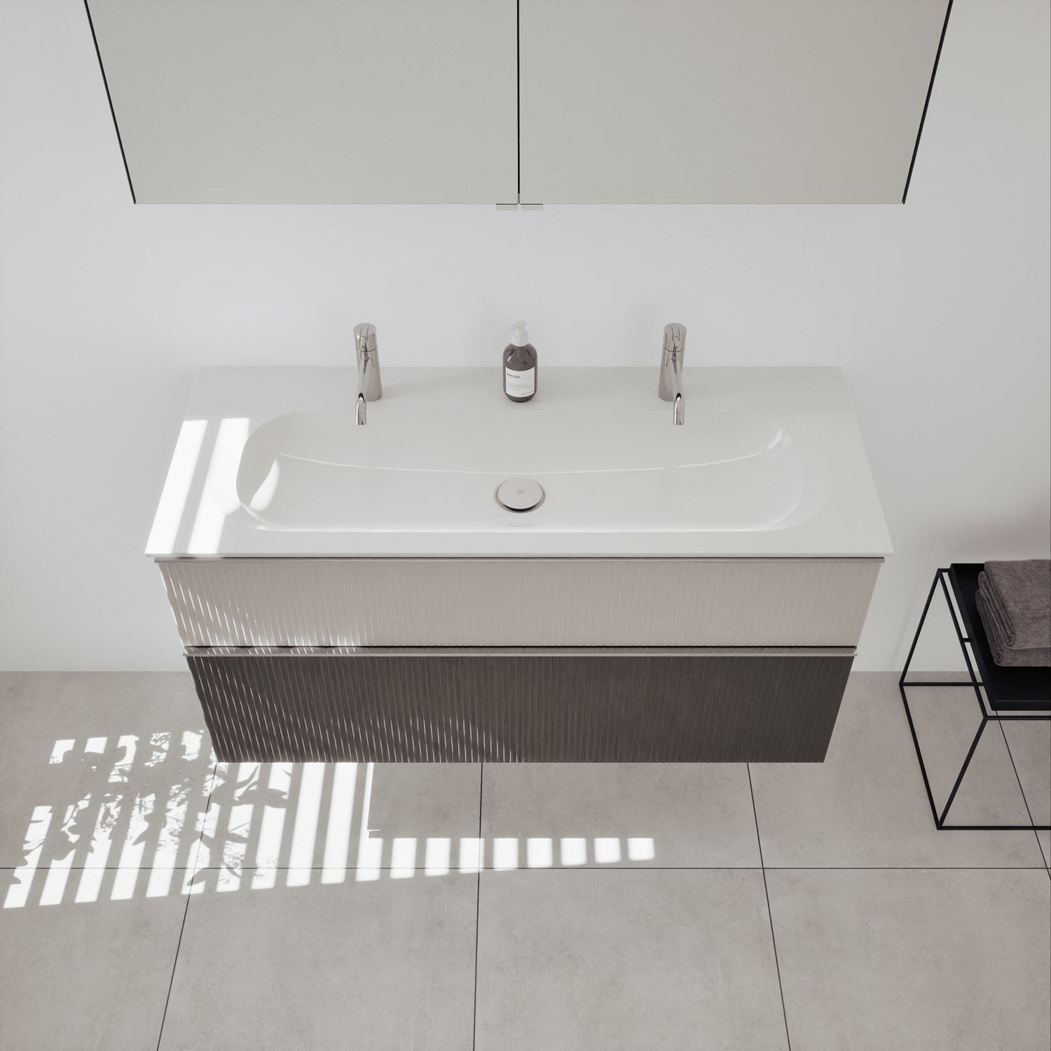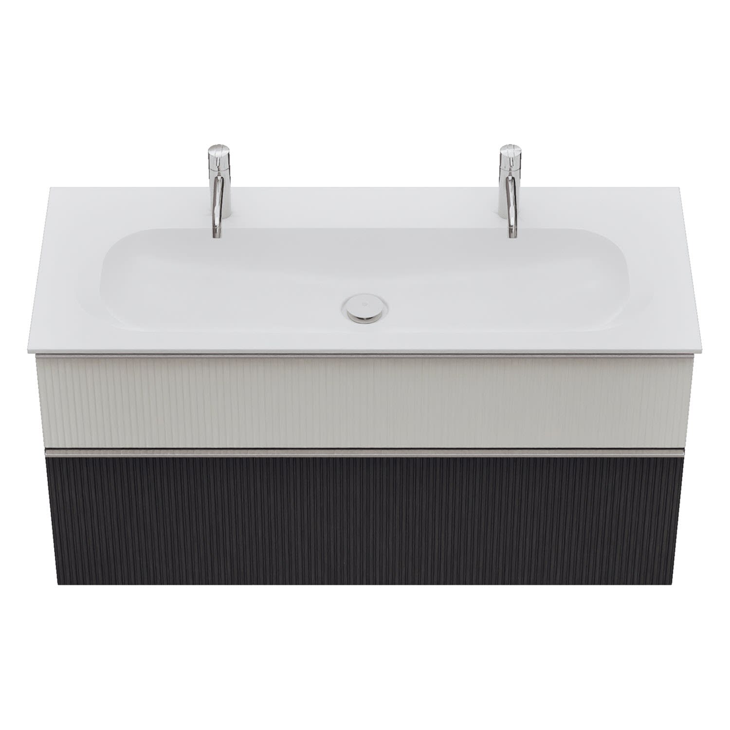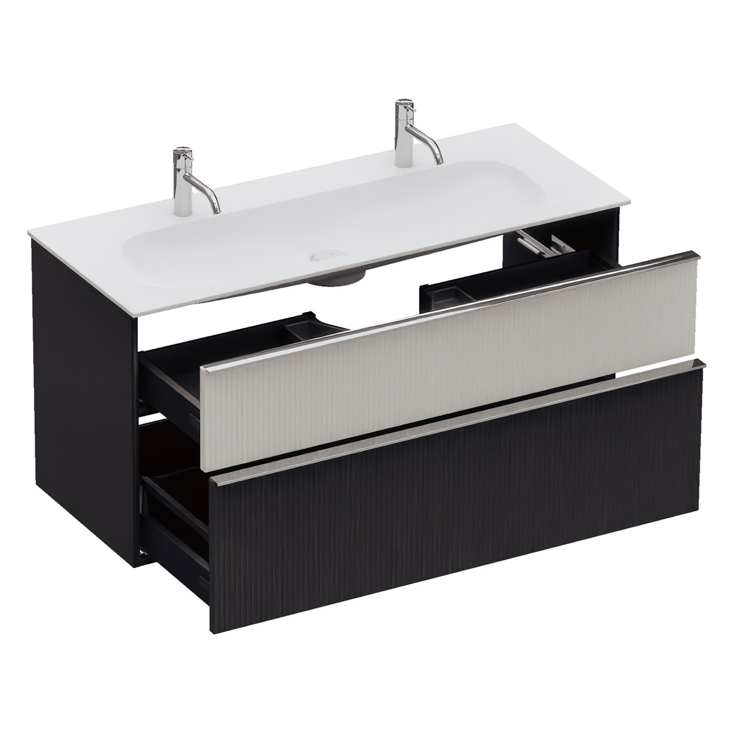 - 1 Schublade oben: 35 cm tief, mit vertikaler Struktur inkl. Siphonausschnitt und Inneneinteilung
