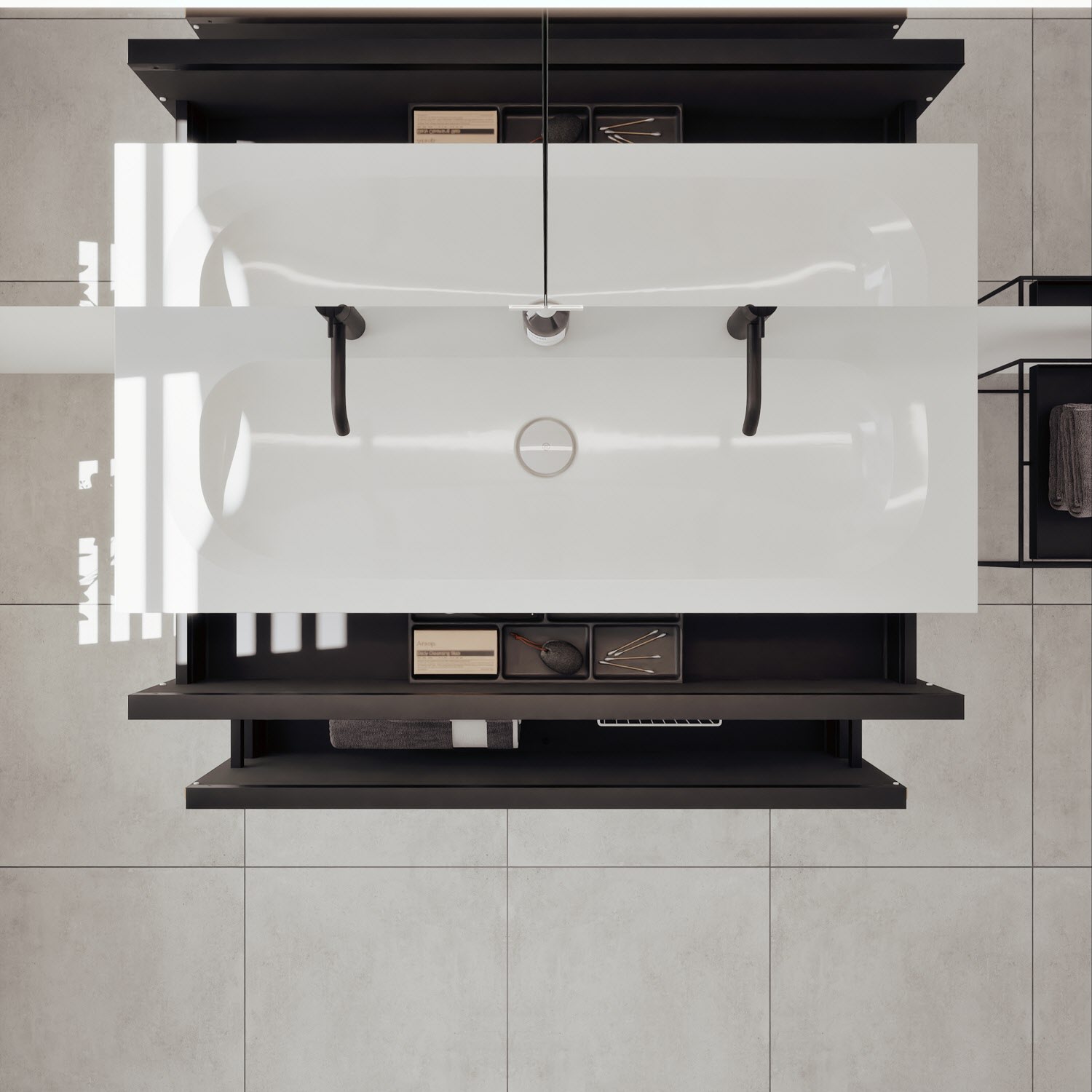- 1 Schublade oben: 35 cm tief, mit vertikaler Struktur inkl. Siphonausschnitt und Inneneinteilung