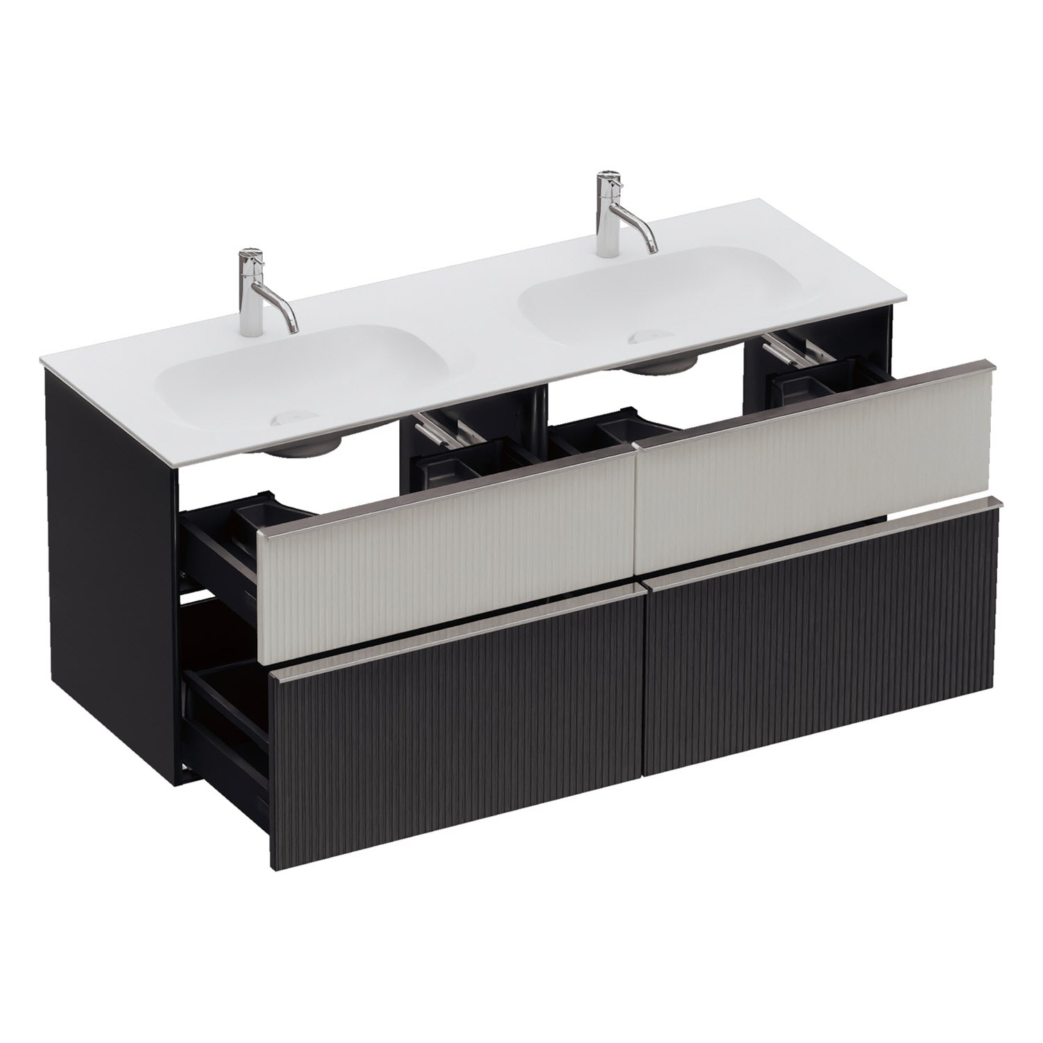 - 2 Schubladen oben, 35 cm tief, mit vertikaler Struktur inkl. mit Siphonausschnitt und Inneneinteilung