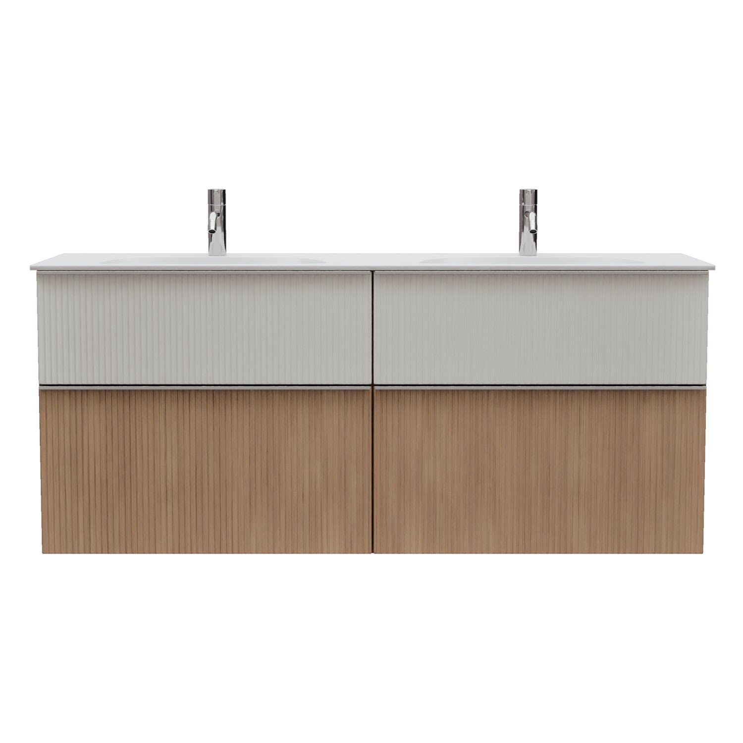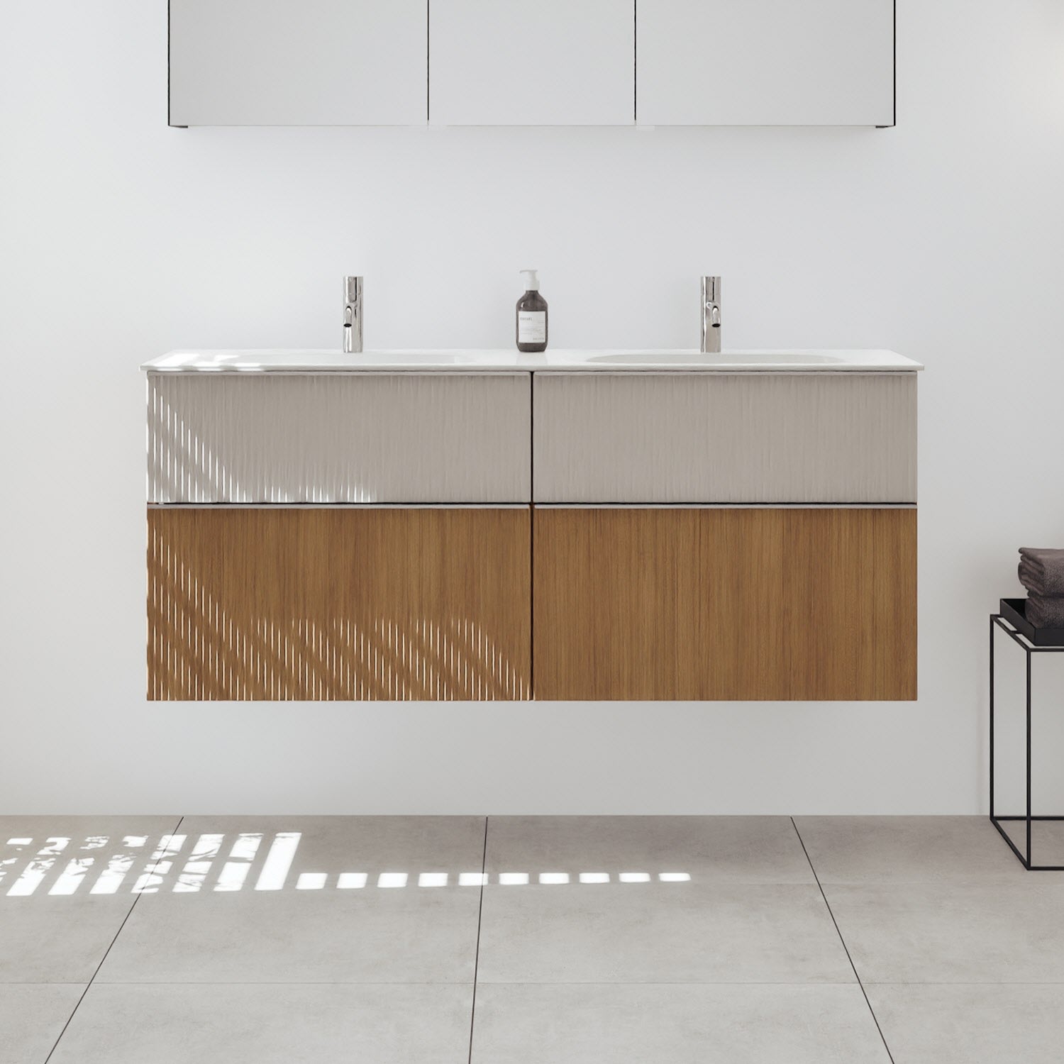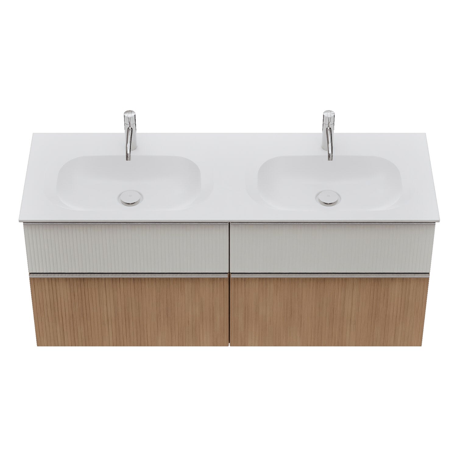 - 2 Schubladen oben, 35 cm tief, mit vertikaler Struktur inkl. mit Siphonausschnitt und Inneneinteilung