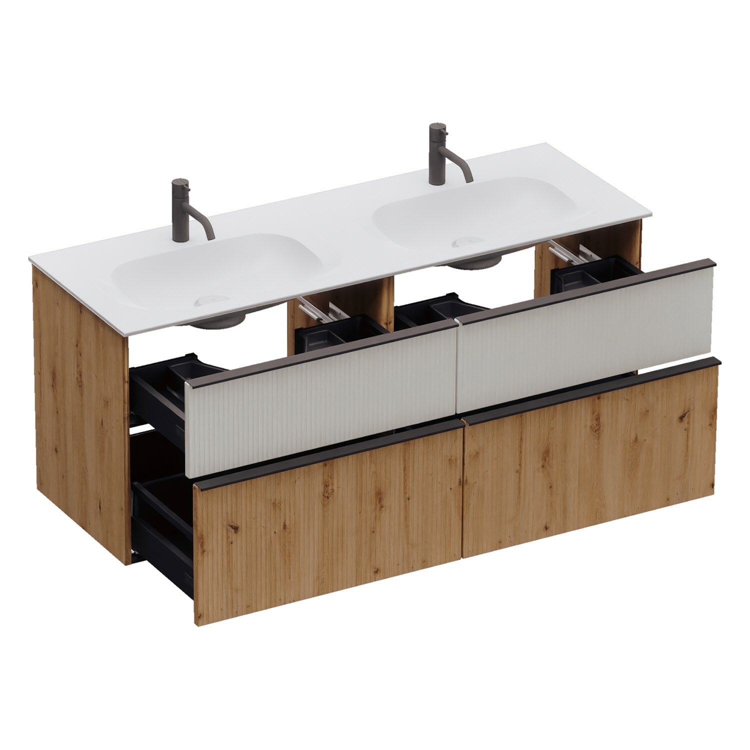 - 2 Schubladen oben, 35 cm tief, mit vertikaler Struktur inkl. mit Siphonausschnitt und Inneneinteilung