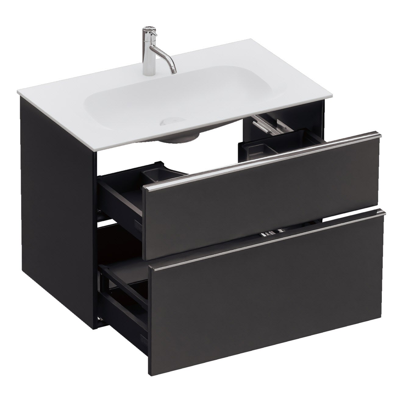 - 1 Schublade oben: 35 cm tief, mit Siphonausschnitt und Inneneinteilung
