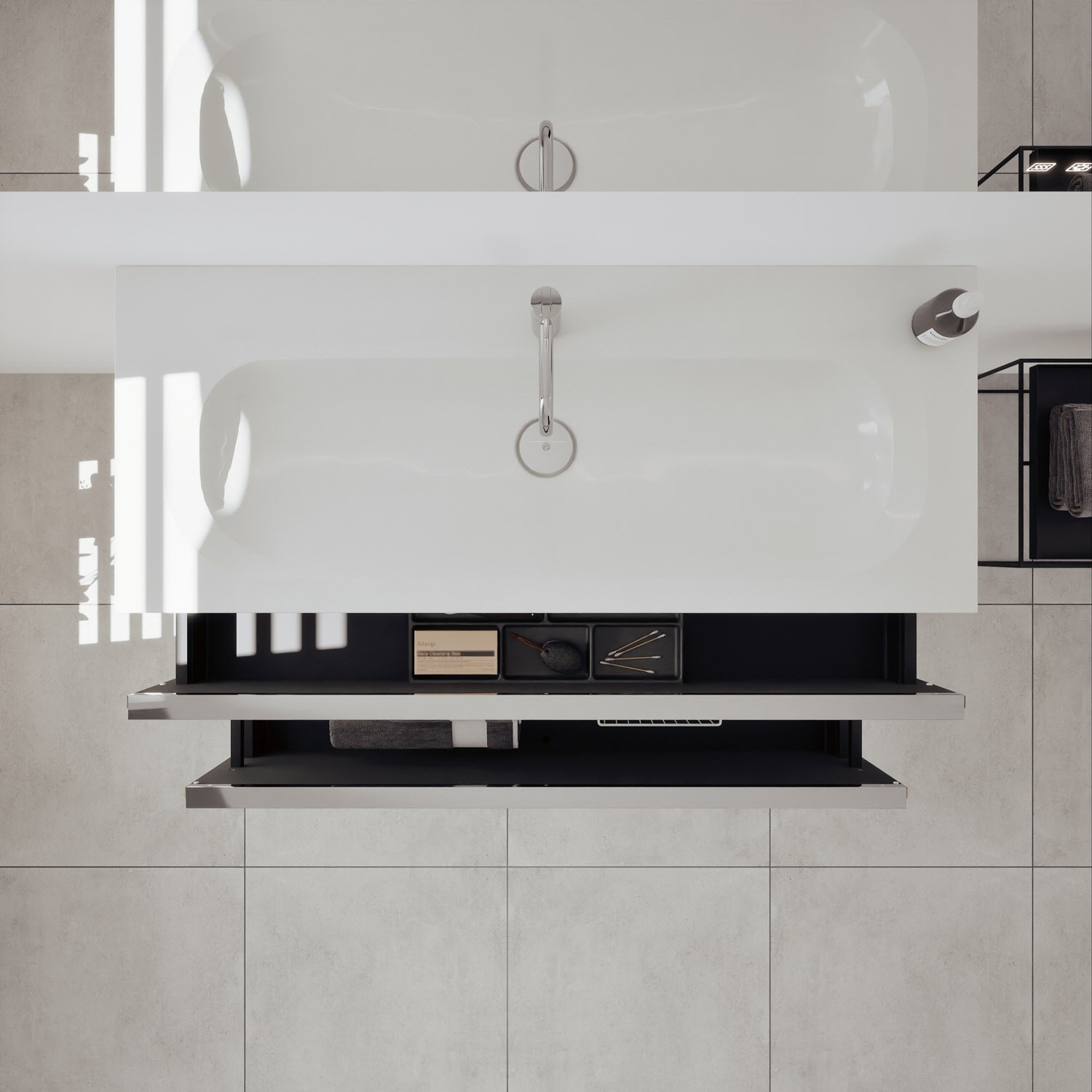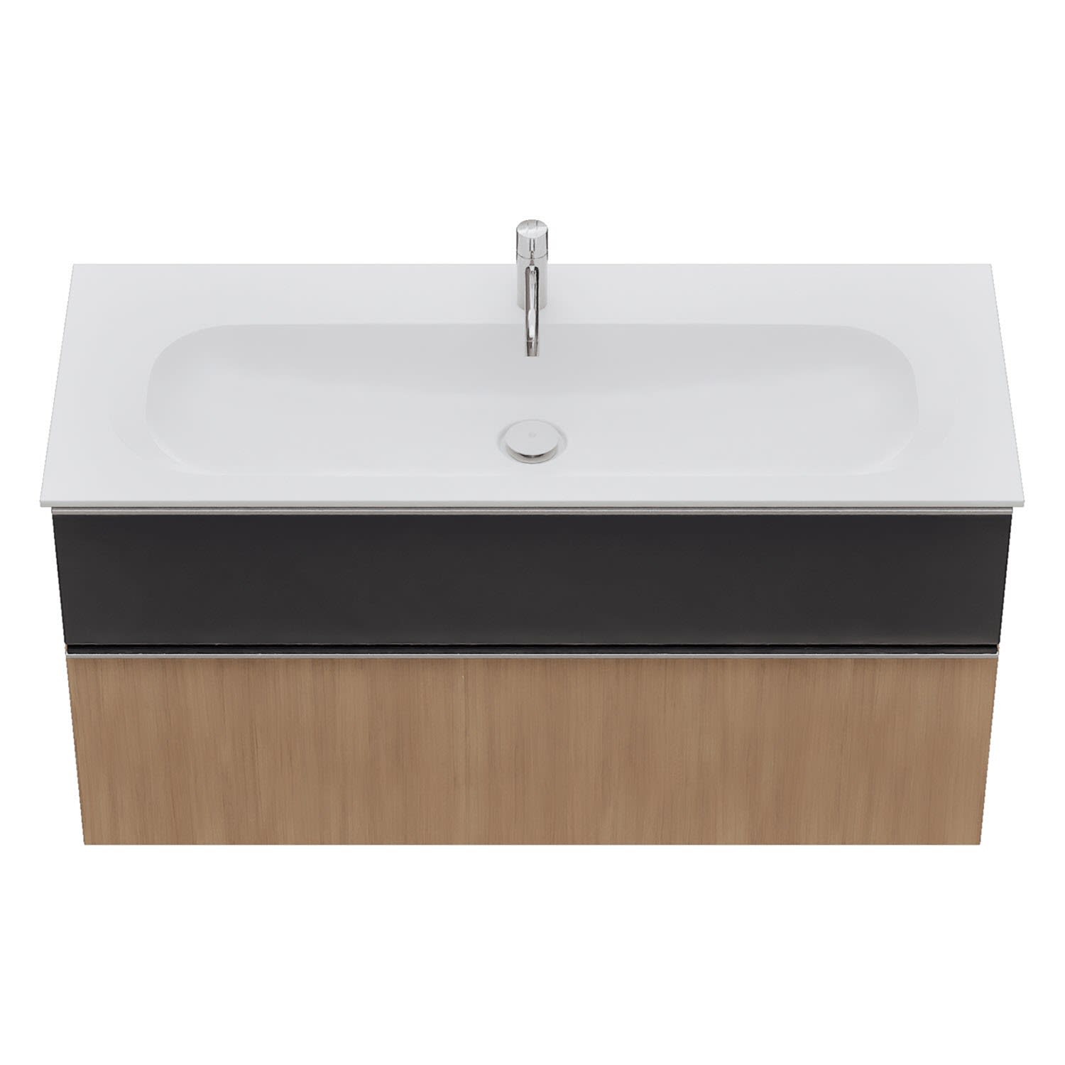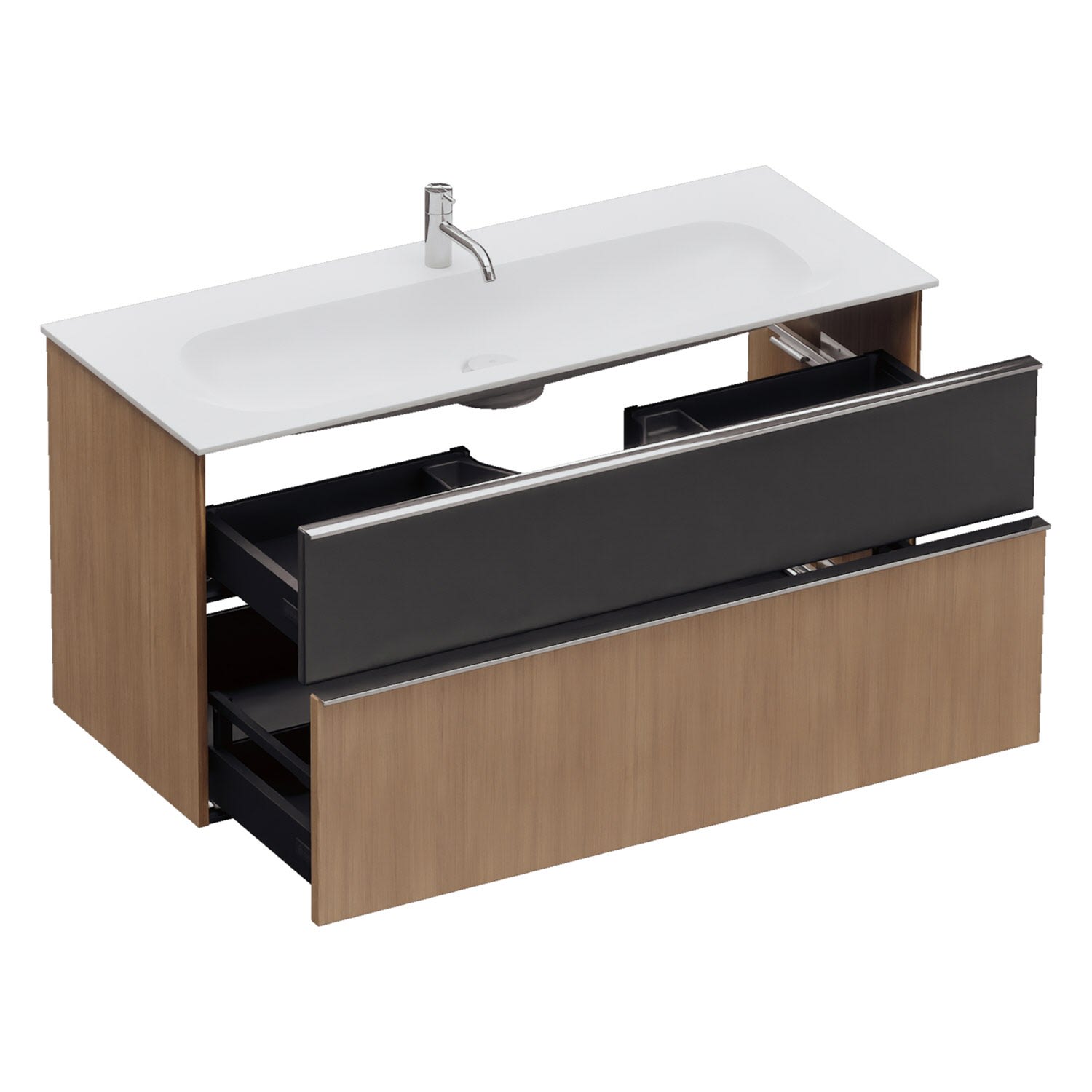 - 1 Schublade oben, 35 cm tief, mit Siphonausschnitt und Inneneinteilung