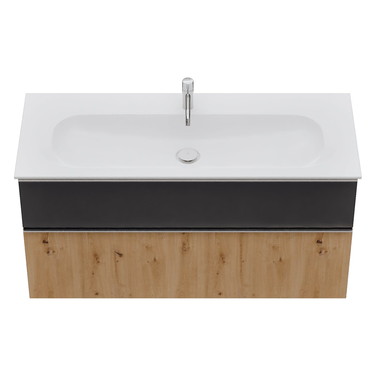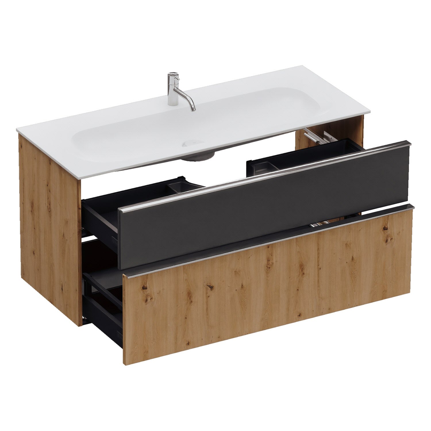 - 1 Schublade oben, 35 cm tief, mit Siphonausschnitt und Inneneinteilung
