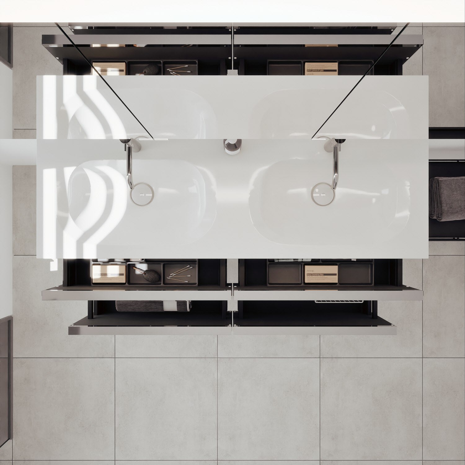 - 2 Schubladen oben, 35 cm tief, mit Siphonausschnitt und Inneneinteilung