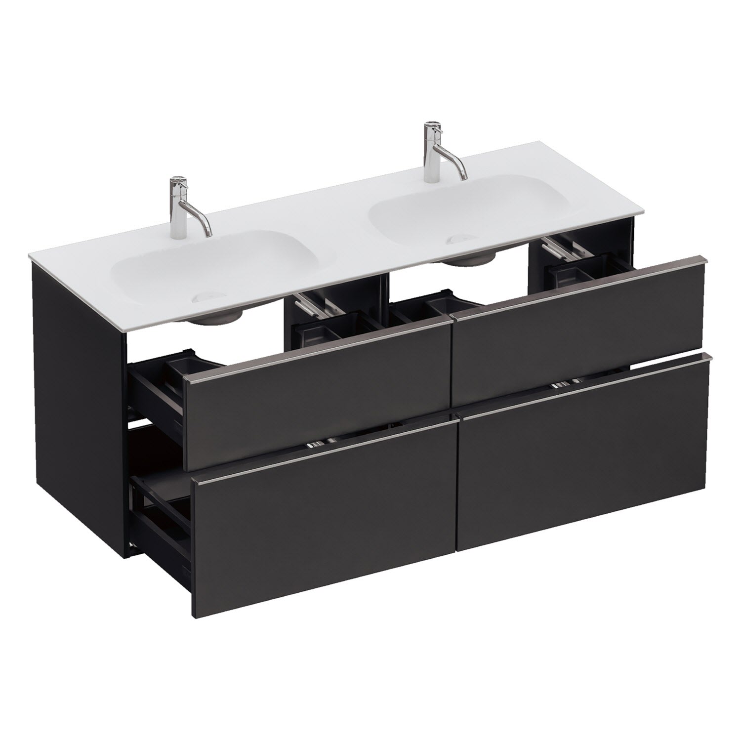 - 2 Schubladen oben, 35 cm tief, mit Siphonausschnitt und Inneneinteilung