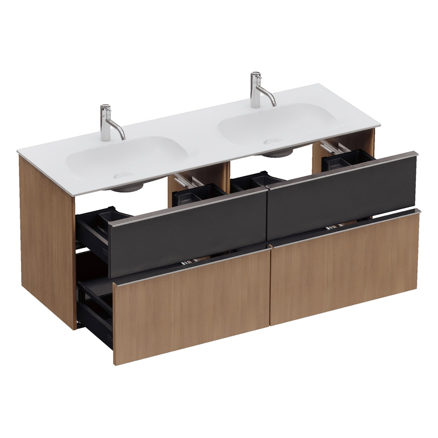 - 2 Schubladen oben, 35 cm tief, mit Siphonausschnitt und Inneneinteilung
