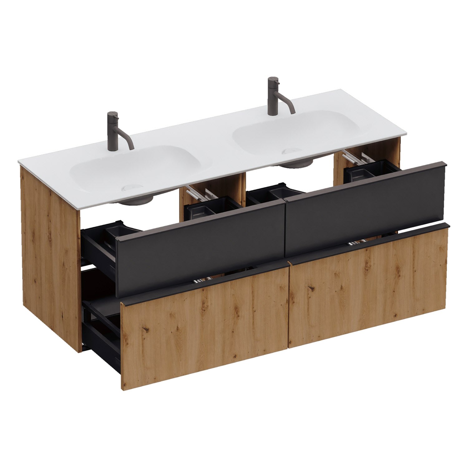 - 2 Schubladen oben, 35 cm tief, mit Siphonausschnitt und Inneneinteilung