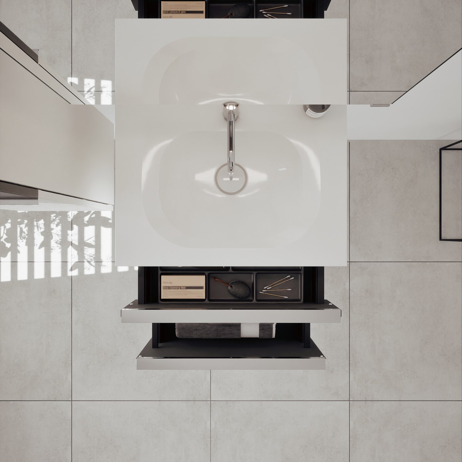 - 1 Schublade oben, 35 cm tief, mit Siphonausschnitt und Inneneinteilung