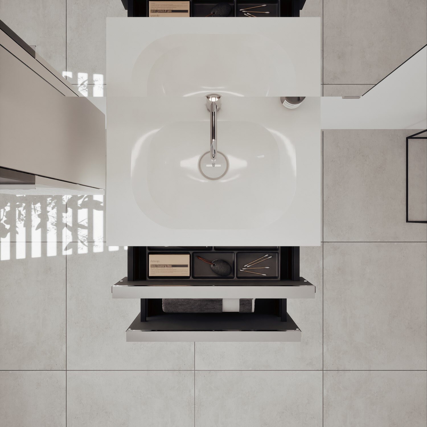 - 1 Schublade oben, 35 cm tief, mit Siphonausschnitt und Inneneinteilung
