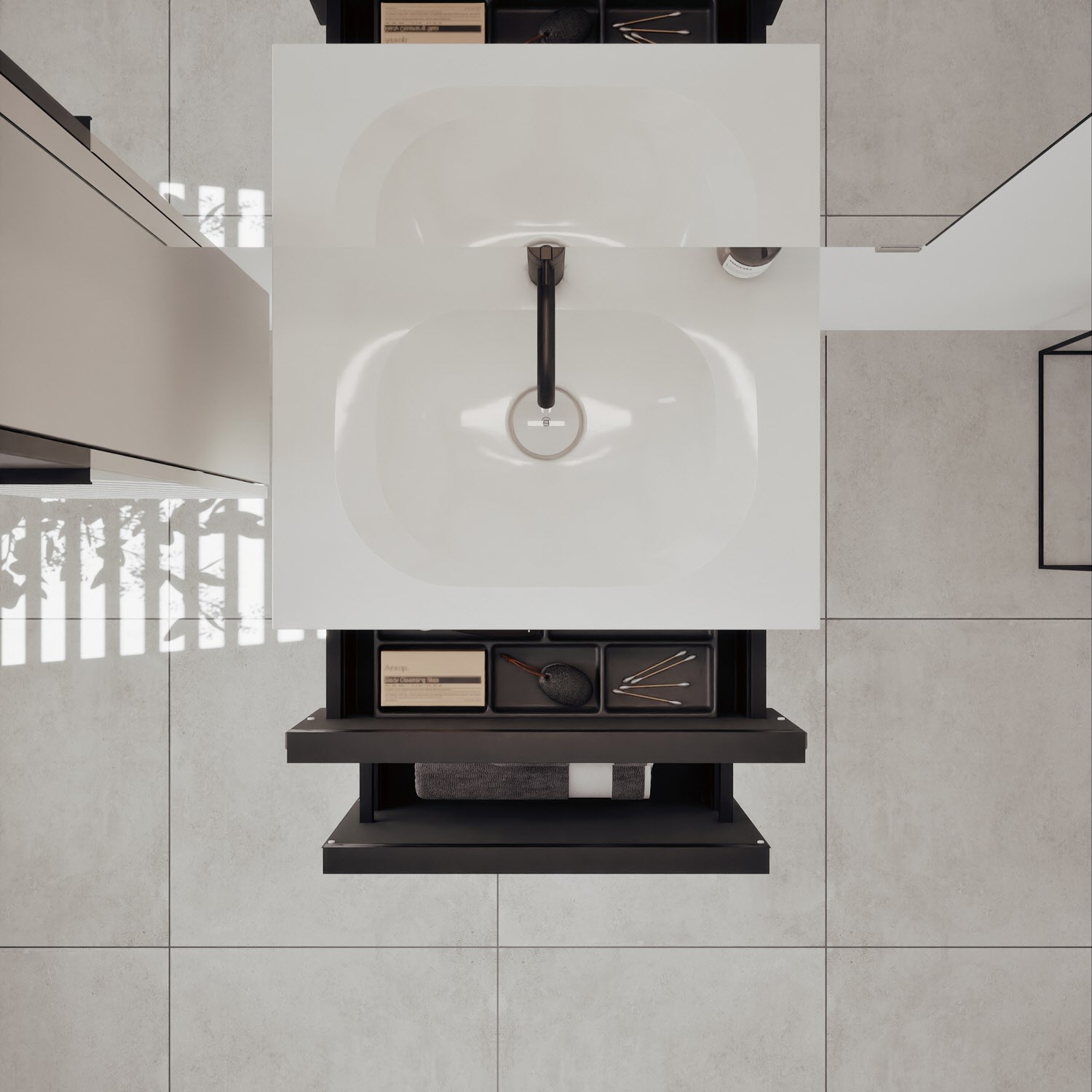 - 1 Schublade oben, 35 cm tief, mit Siphonausschnitt und Inneneinteilung