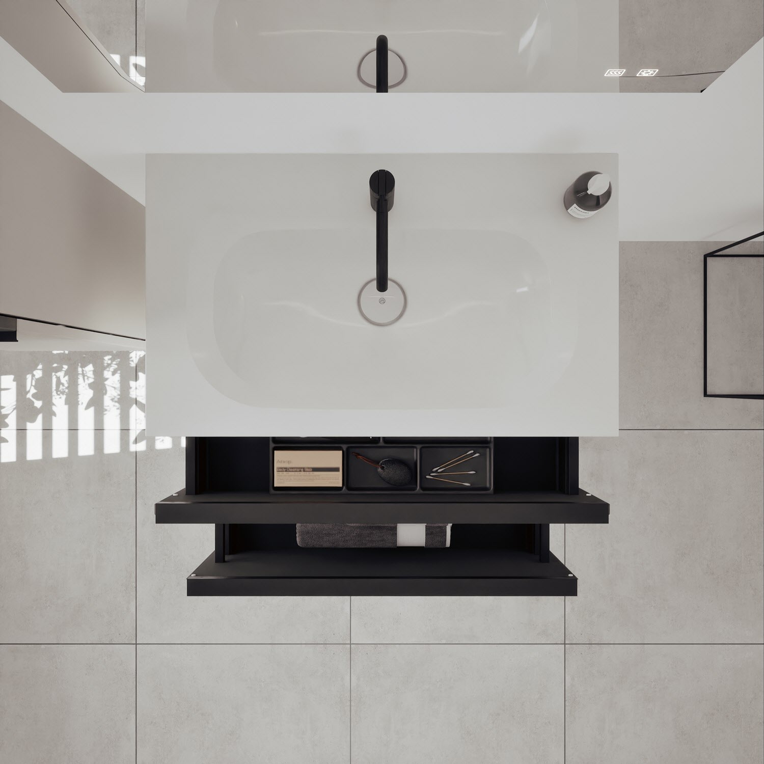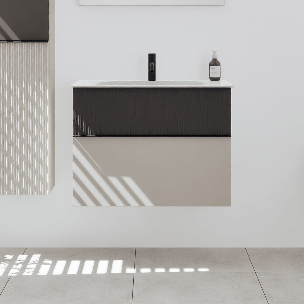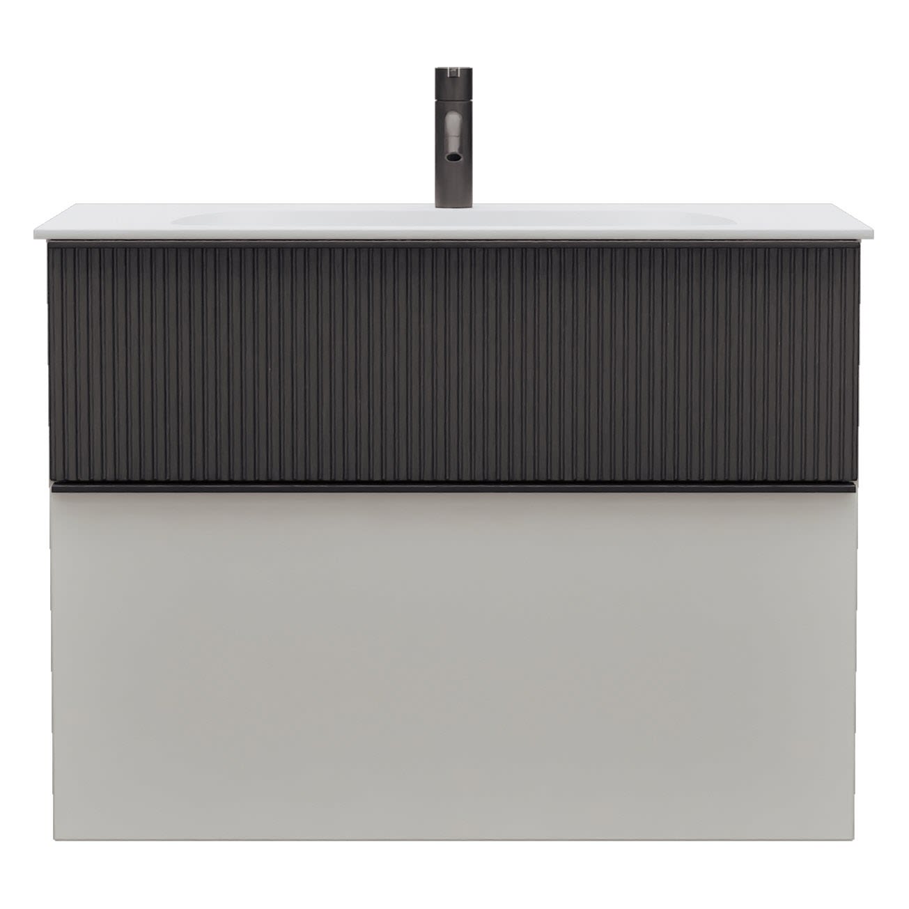 - 1 Schublade oben, 35 cm tief, mit vertikaler Struktur inkl. Siphonausschnitt und Inneneinteilung