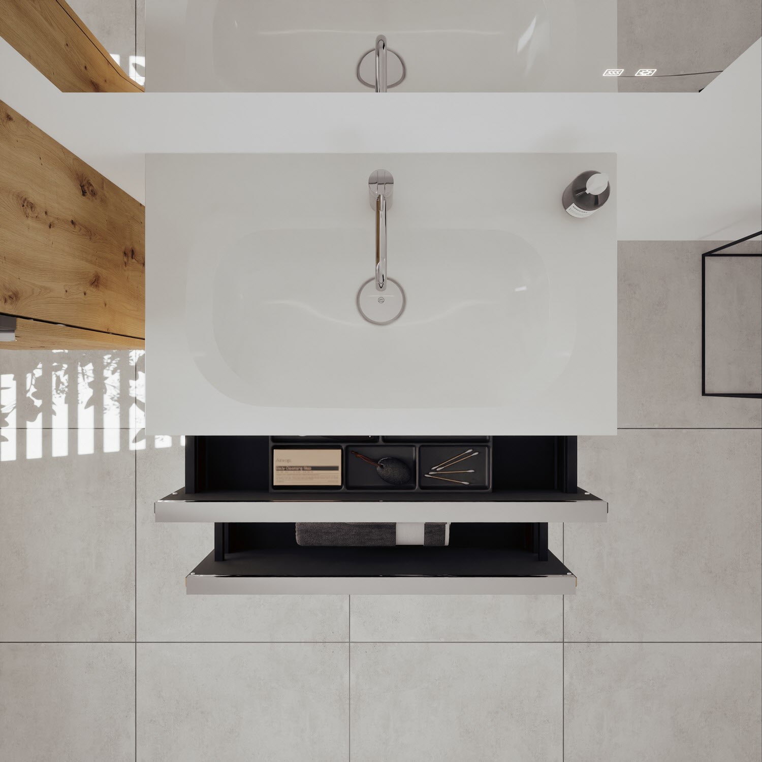 - 1 Schublade oben, 35 cm tief, mit vertikaler Struktur inkl. Siphonausschnitt und Inneneinteilung
