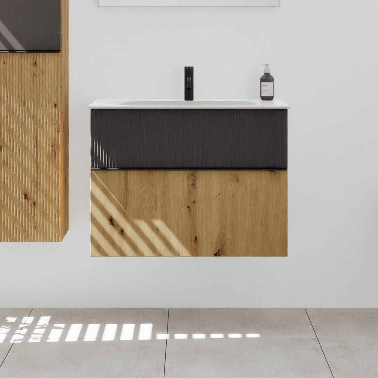- 1 Schublade oben, 35 cm tief, mit vertikaler Struktur inkl. Siphonausschnitt und Inneneinteilung