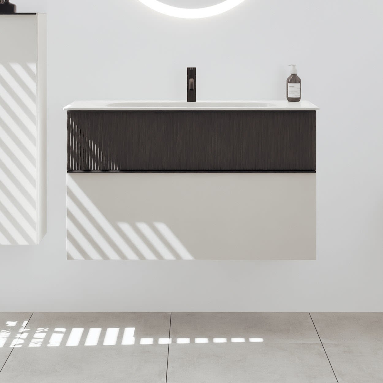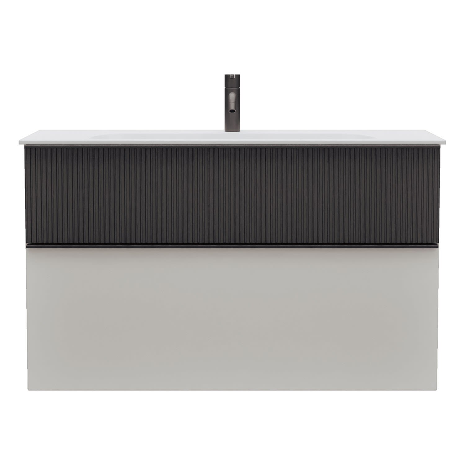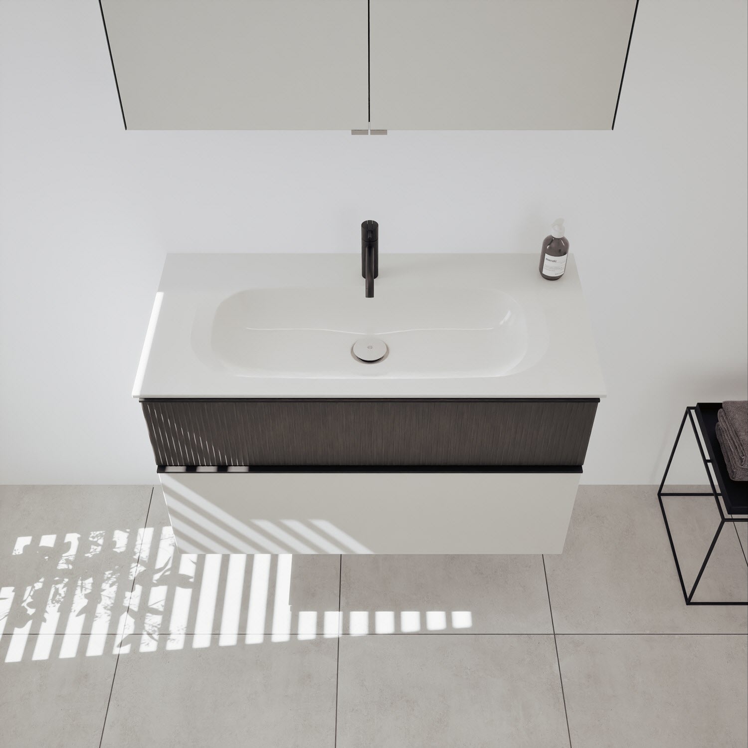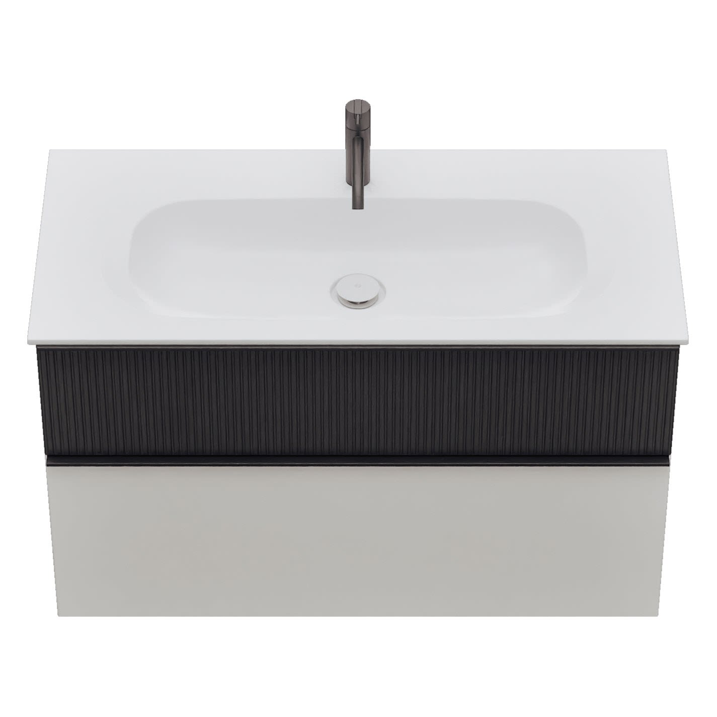 - 1 Schublade oben, 35 cm tief, mit vertikaler Struktur inkl. Siphonausschnitt und Inneneinteilung