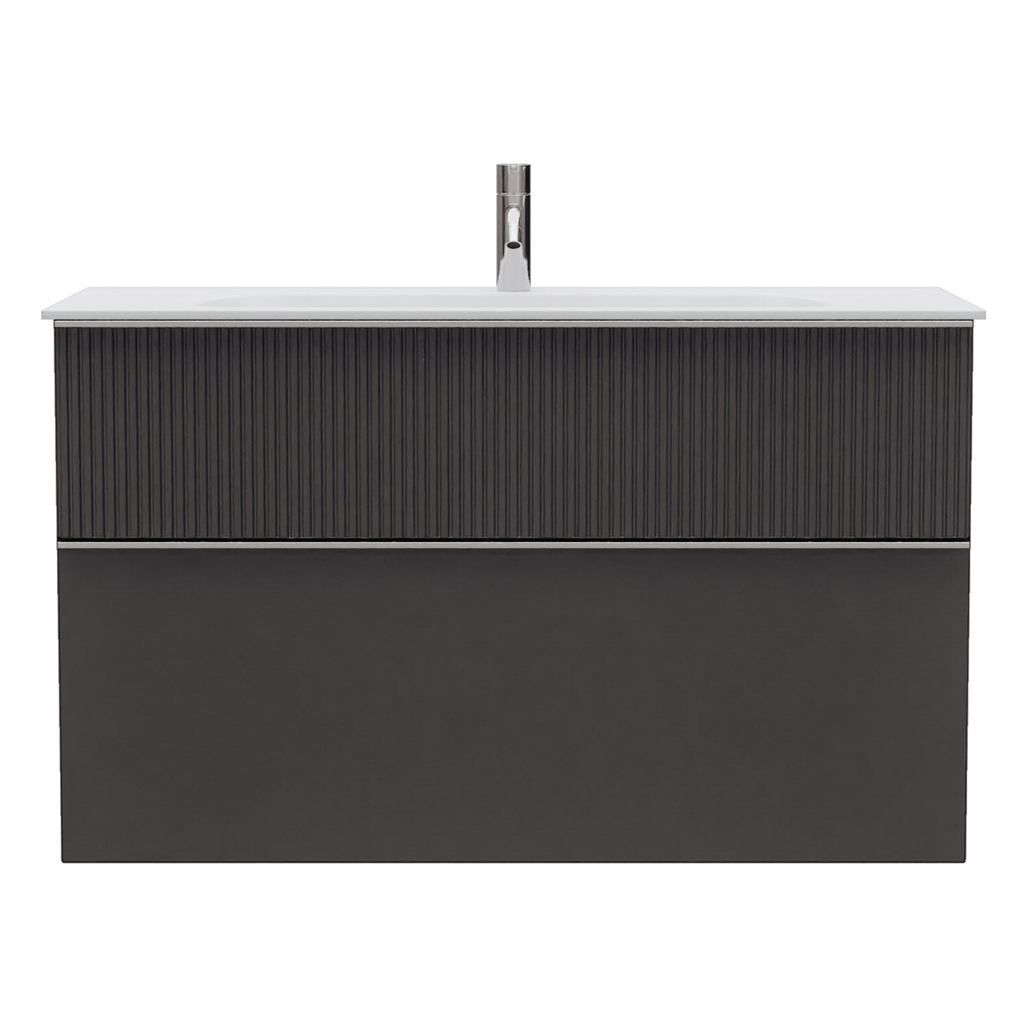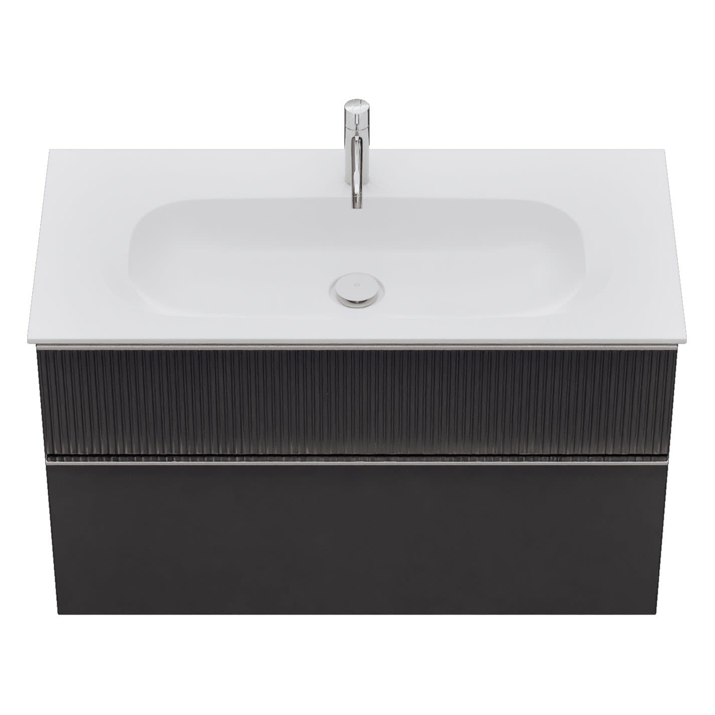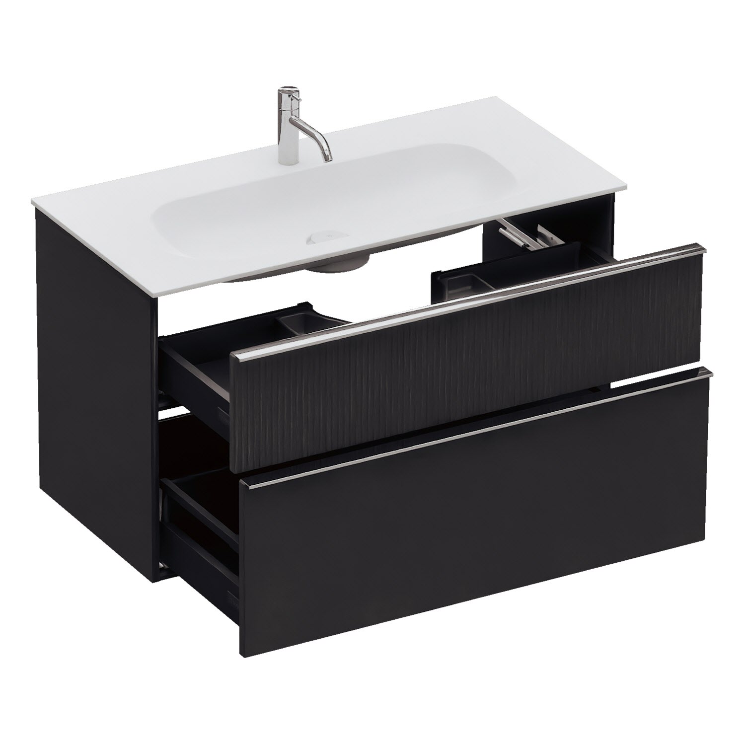 - 1 Schublade oben, 35 cm tief, mit vertikaler Struktur inkl. Siphonausschnitt und Inneneinteilung