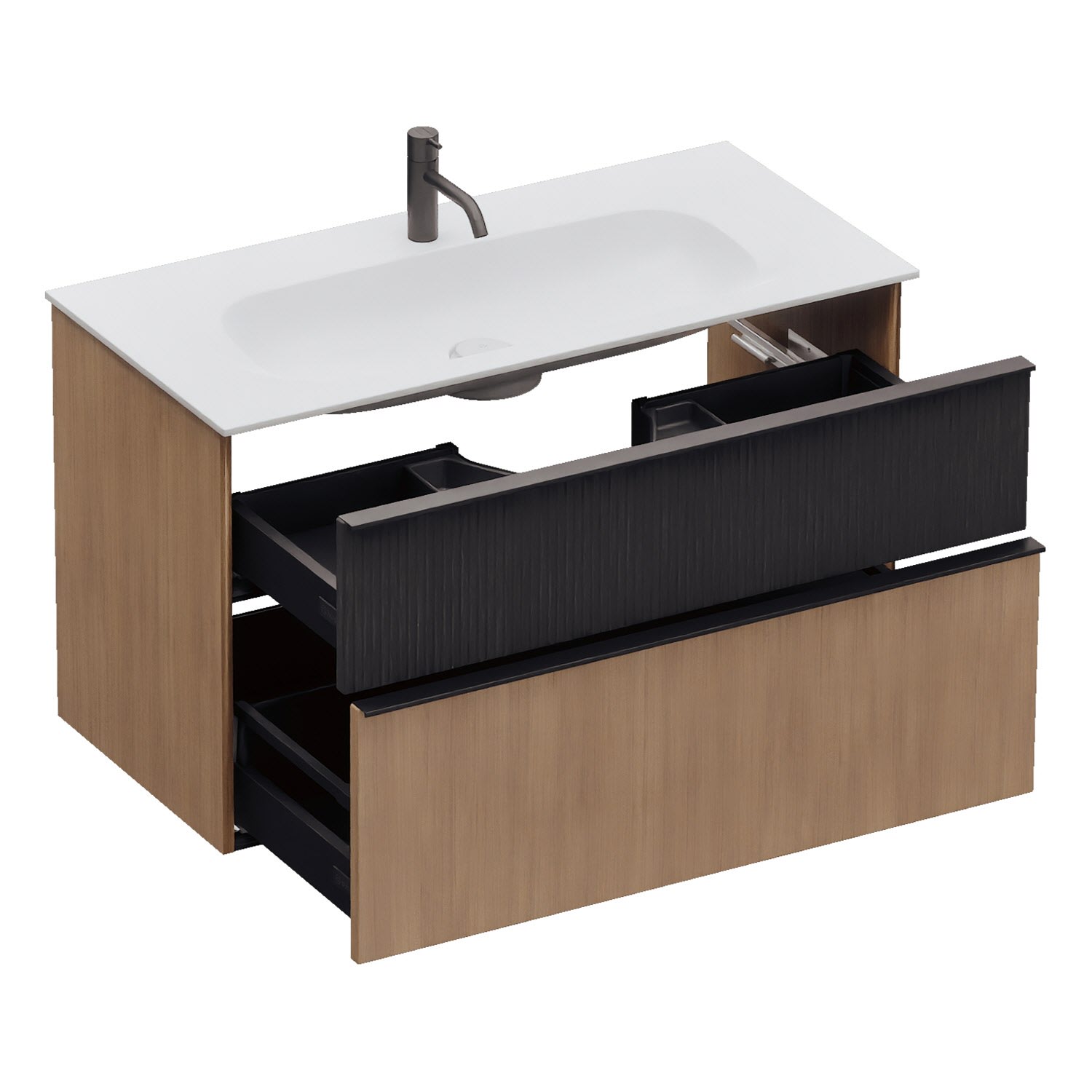 - 1 Schublade oben, 35 cm tief, mit vertikaler Struktur inkl. Siphonausschnitt und Inneneinteilung