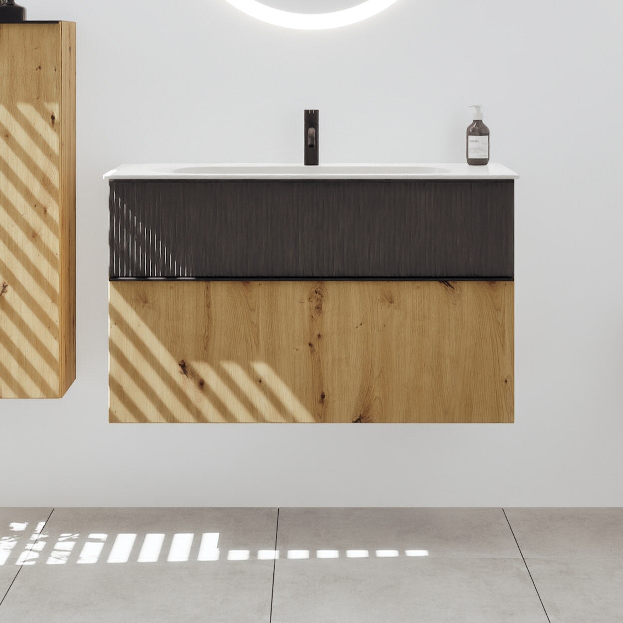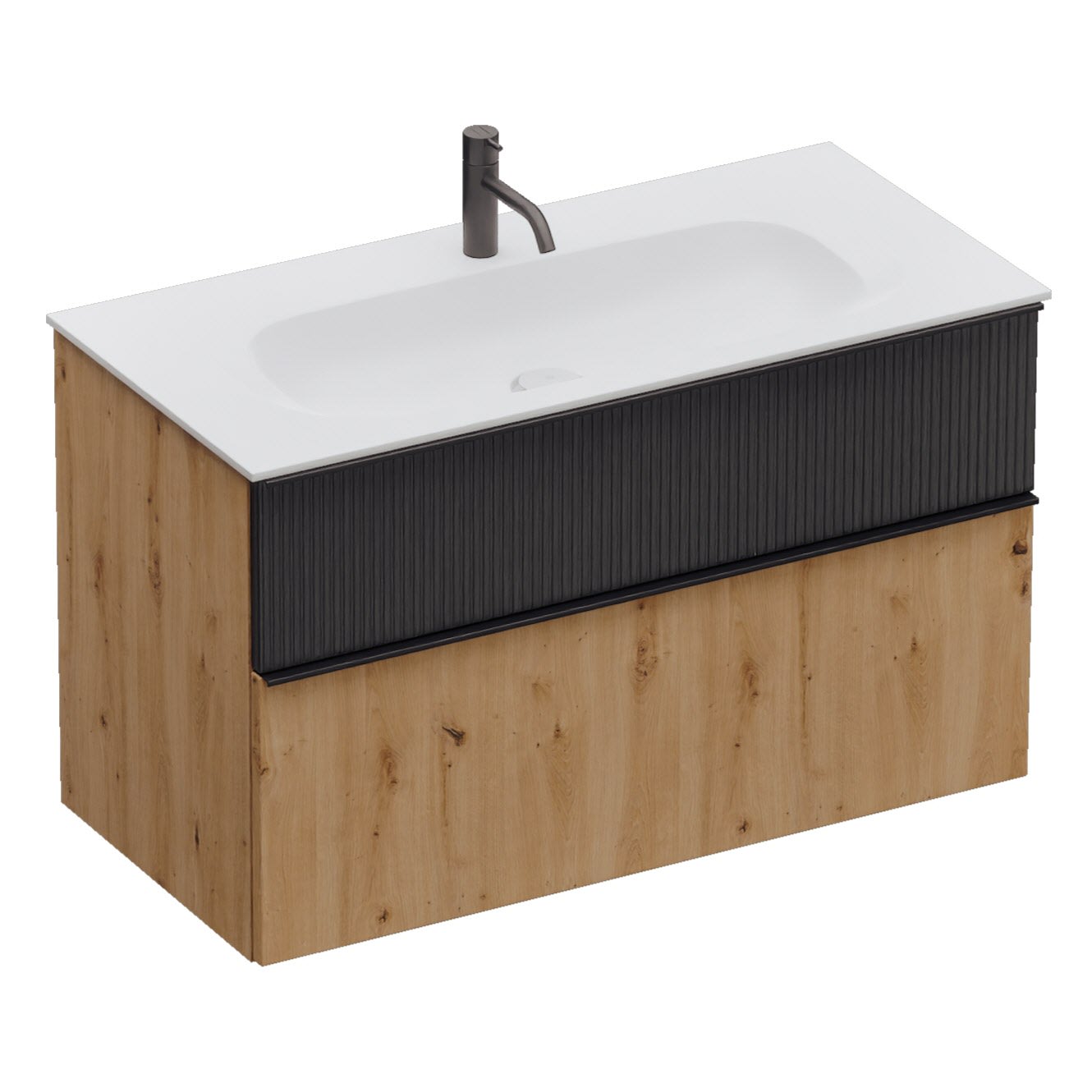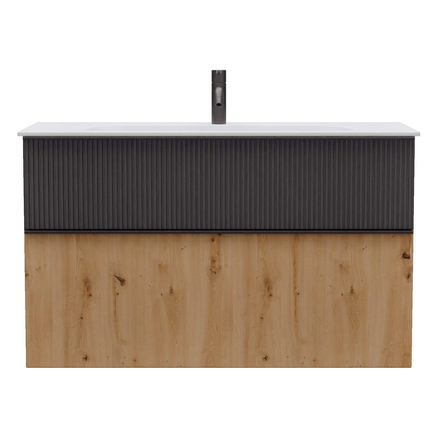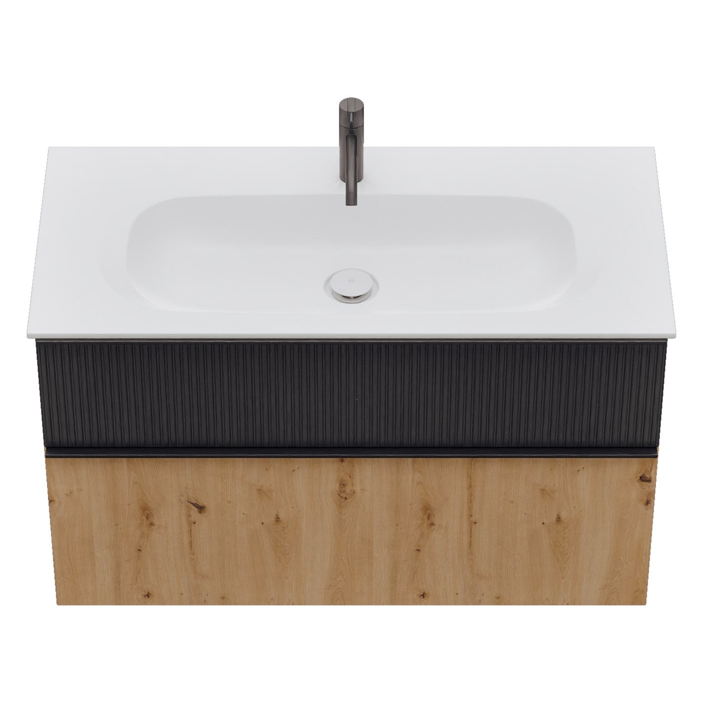 - 1 Schublade oben, 35 cm tief, mit vertikaler Struktur inkl. Siphonausschnitt und Inneneinteilung