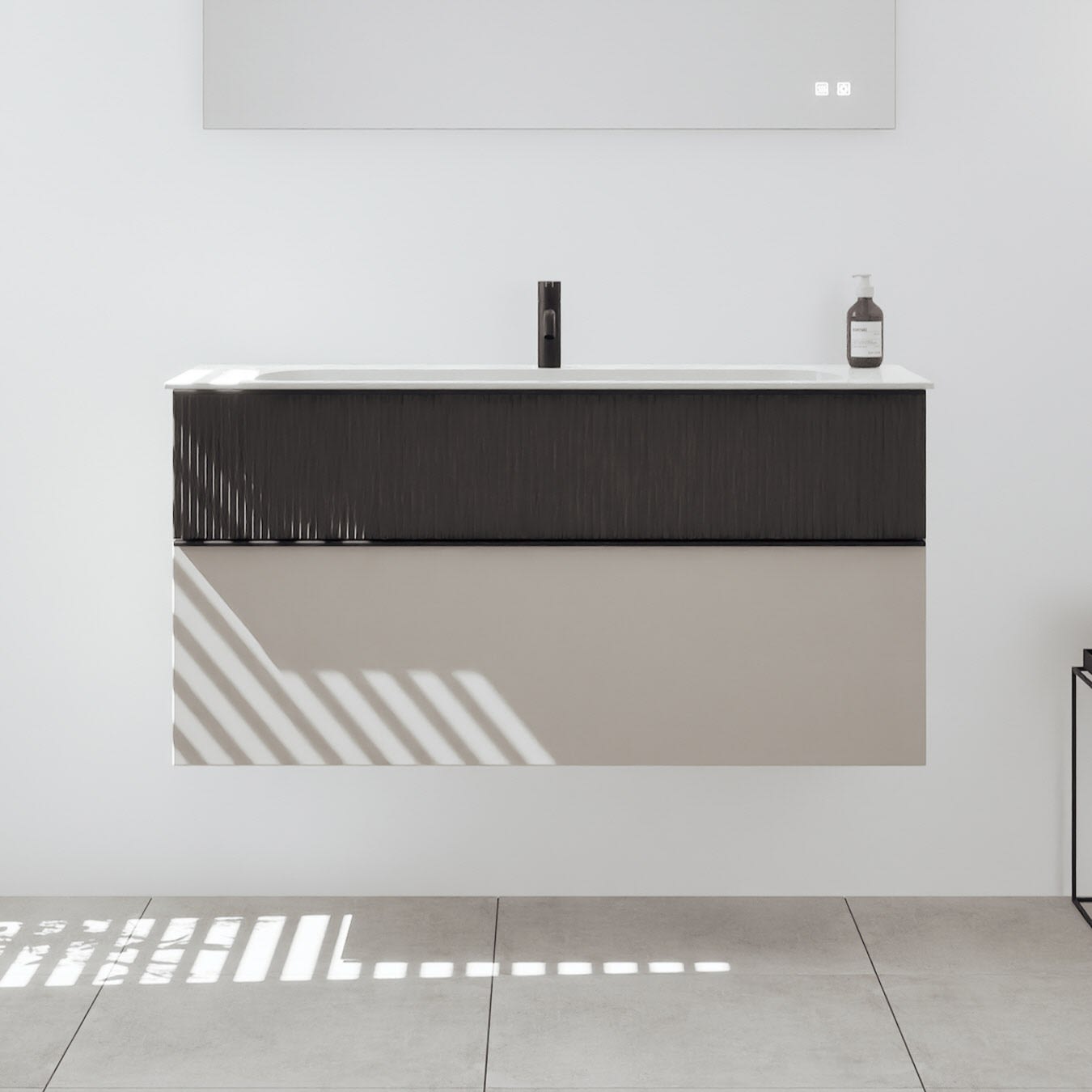 - 1 Schublade oben: 35 cm tief, mit vertikaler Struktur inkl. Siphonausschnitt und Inneneinteilung