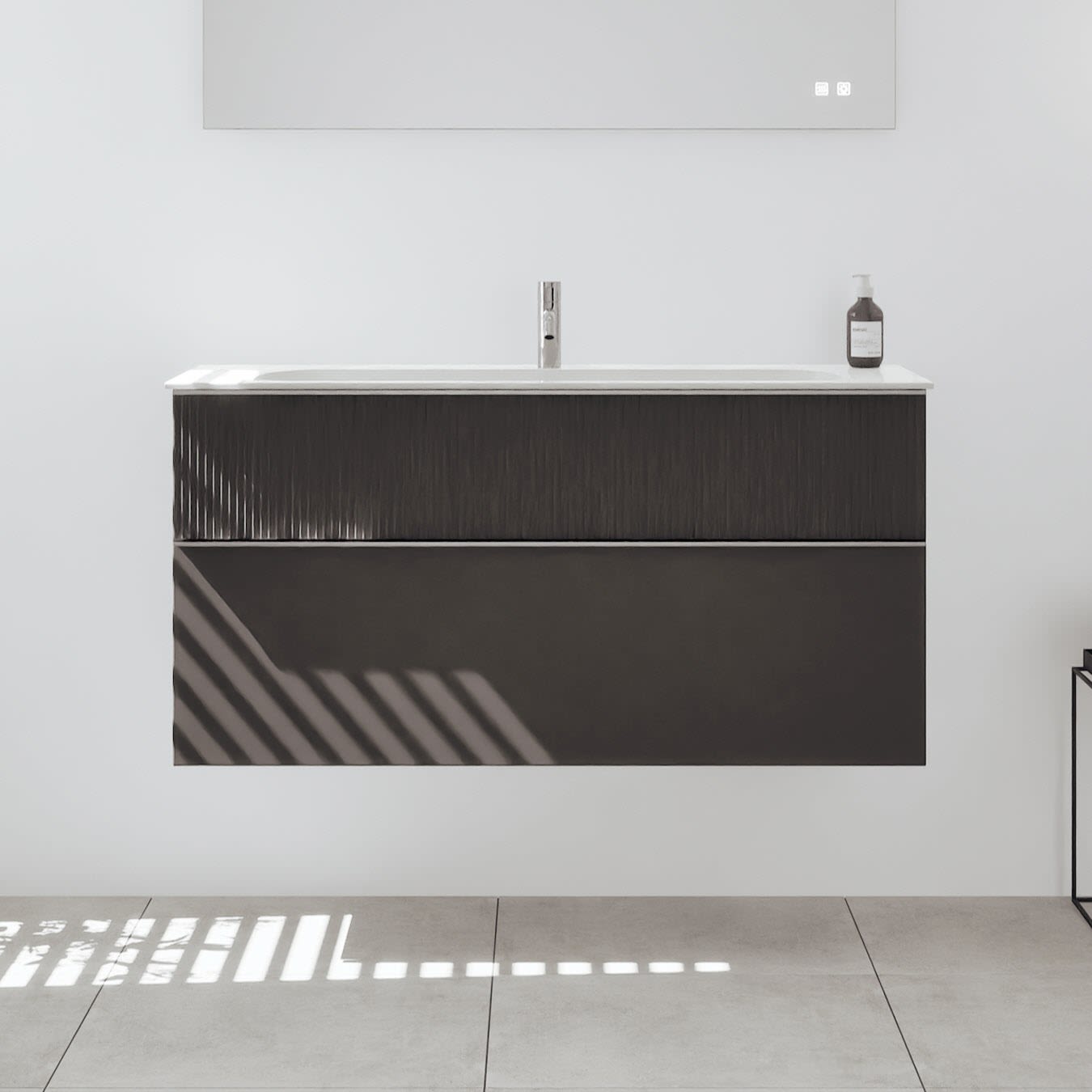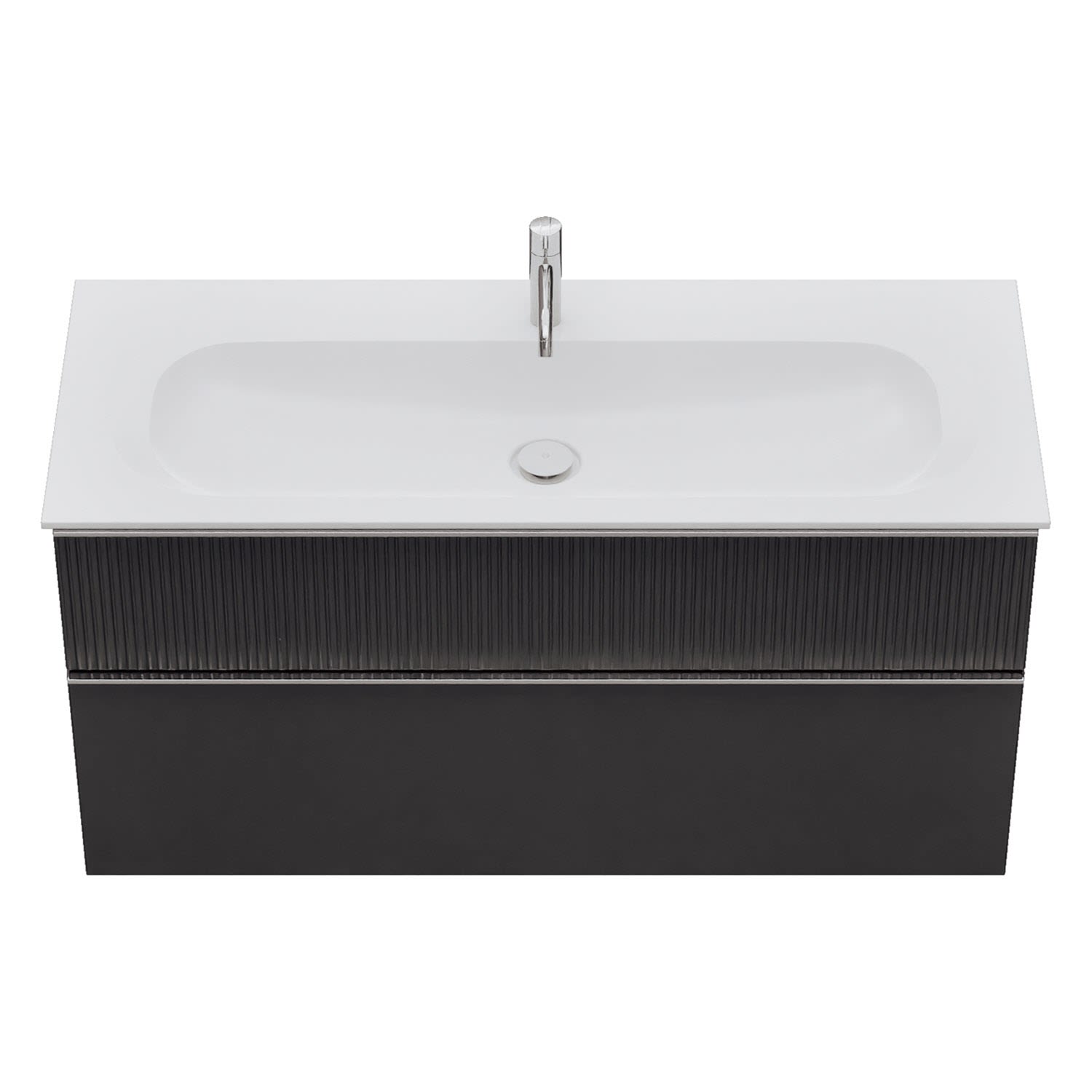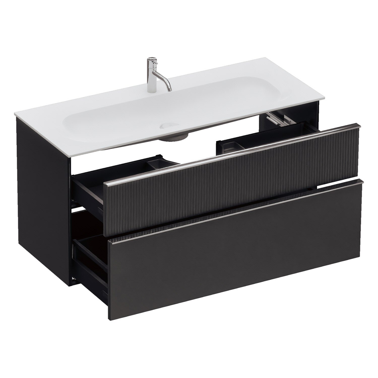 - 1 Schublade oben: 35 cm tief, mit vertikaler Struktur inkl. Siphonausschnitt und Inneneinteilung