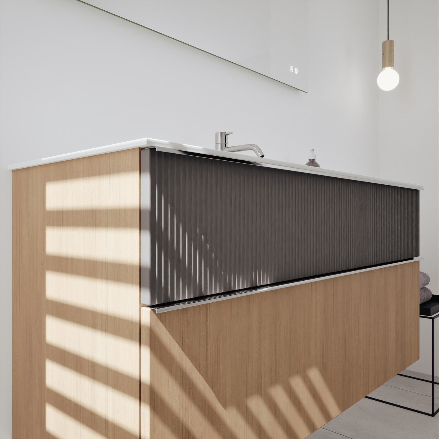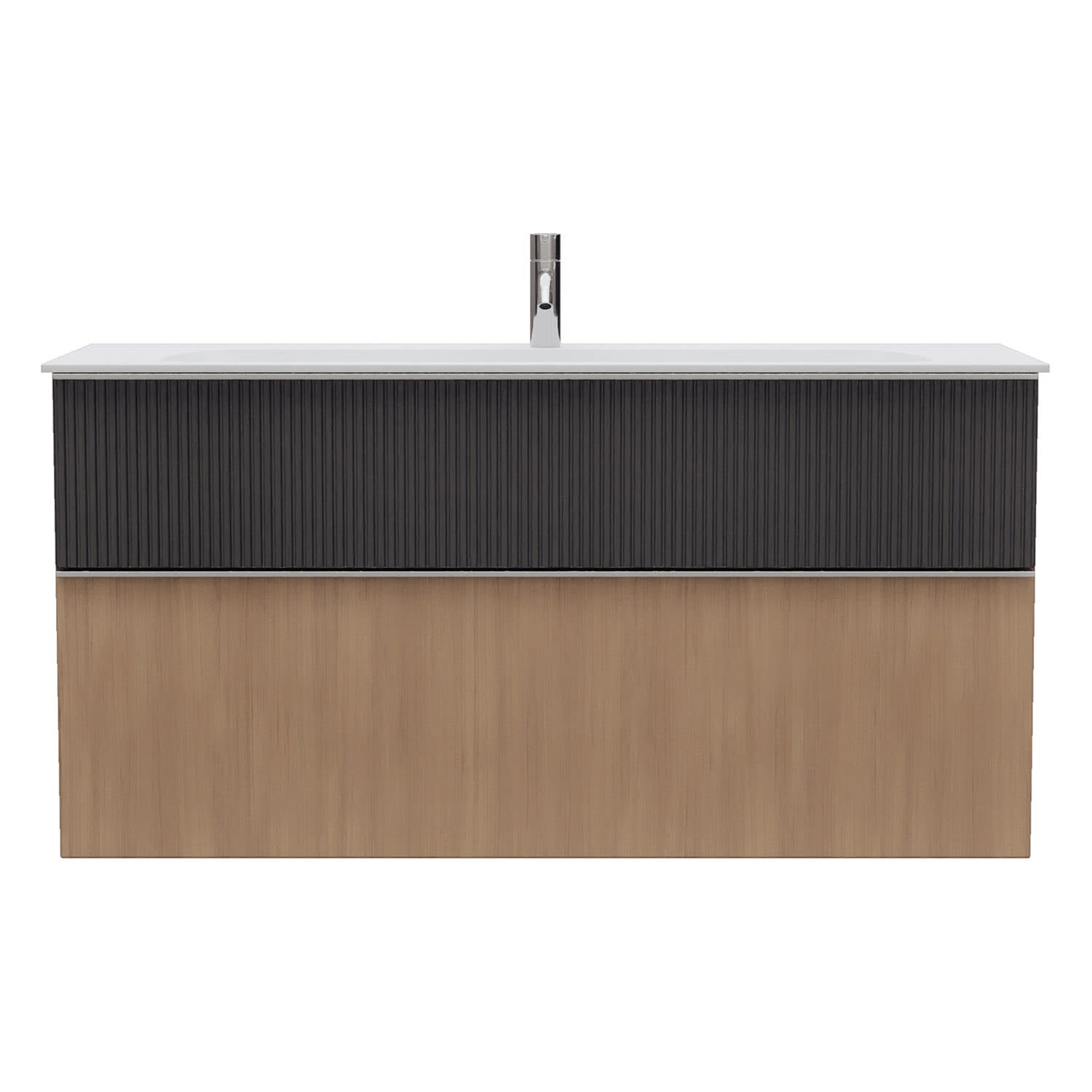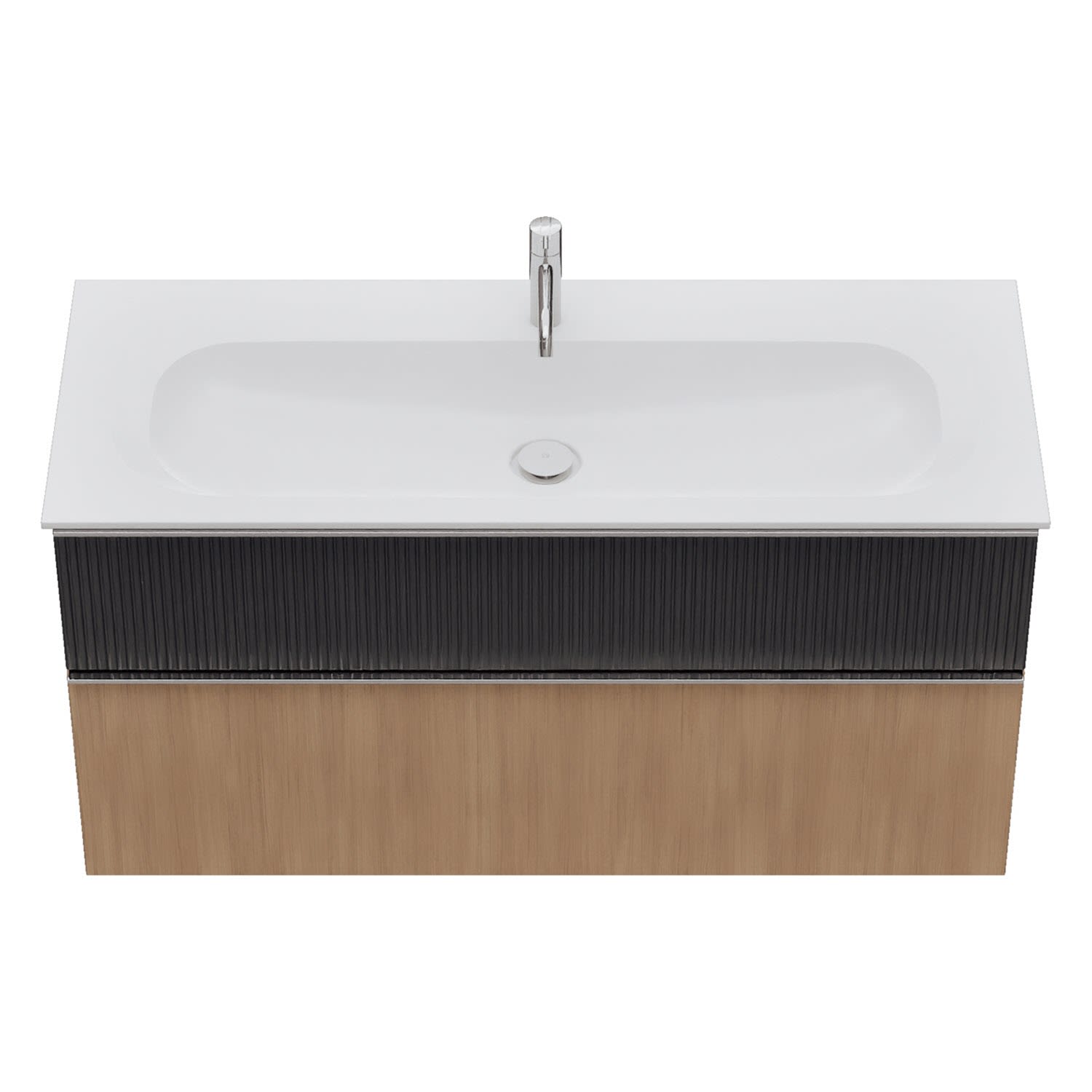 - 1 Schublade oben: 35 cm tief, mit vertikaler Struktur inkl. Siphonausschnitt und Inneneinteilung