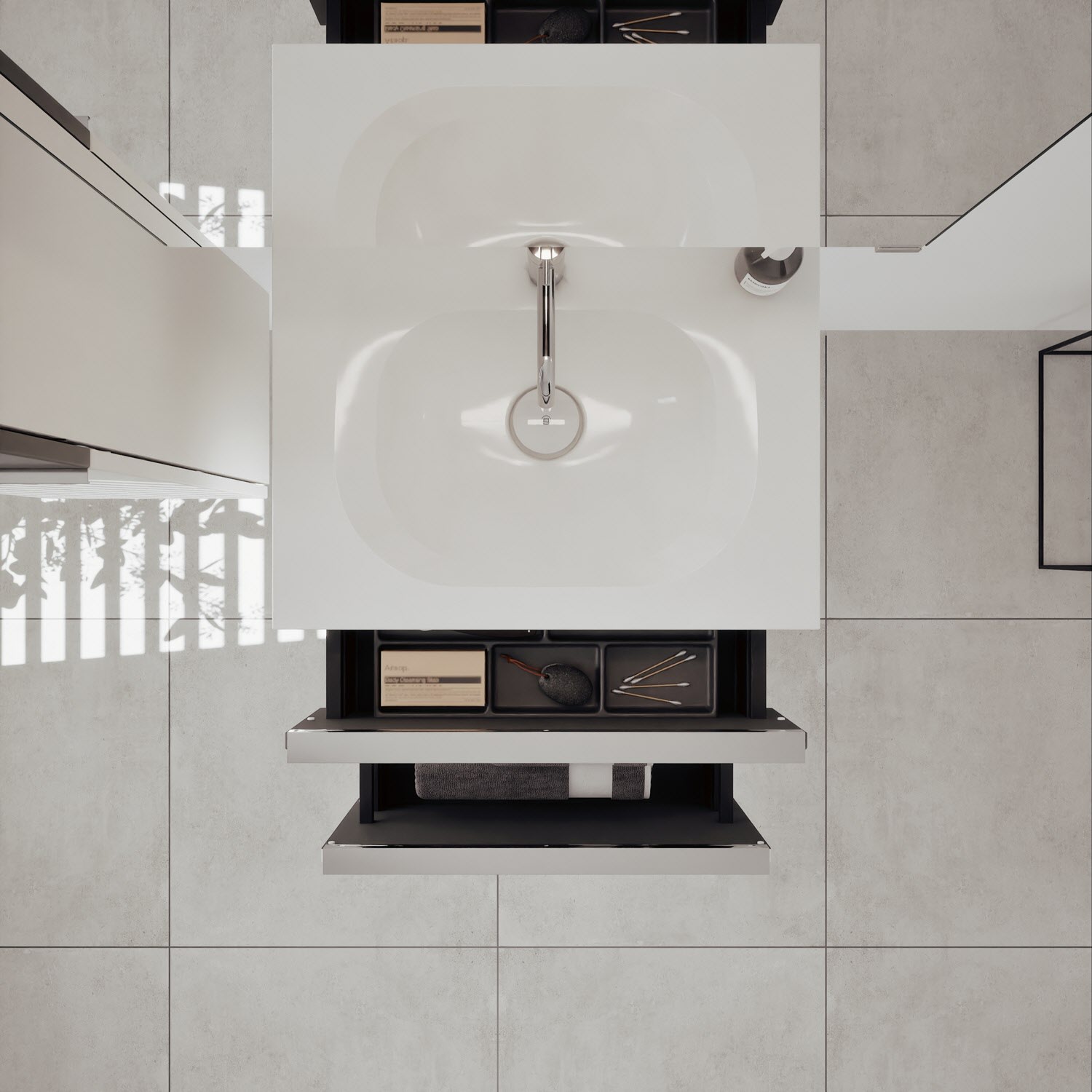 - 1 Schublade oben, 35 cm tief, mit vertikaler Struktur inkl. Siphonausschnitt und Inneneinteilung