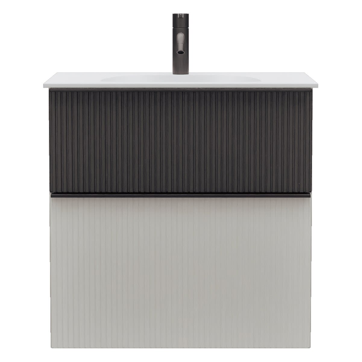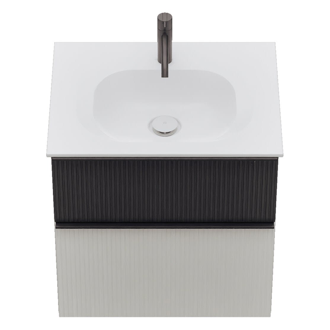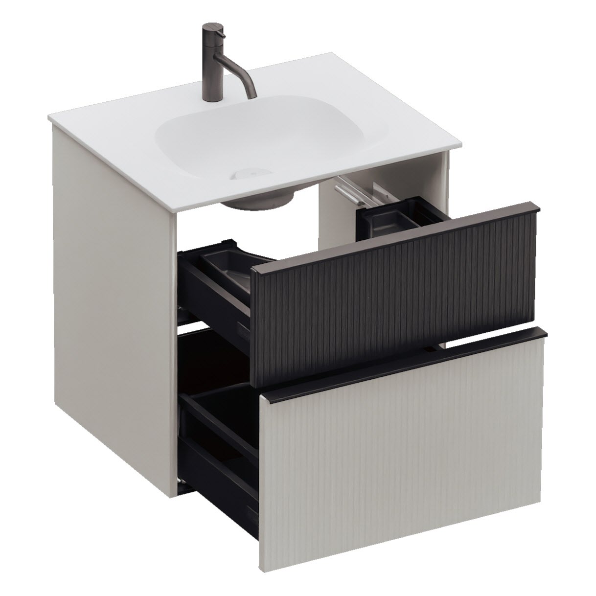 - 1 Schublade oben, 35 cm tief, mit vertikaler Struktur inkl. Siphonausschnitt und Inneneinteilung