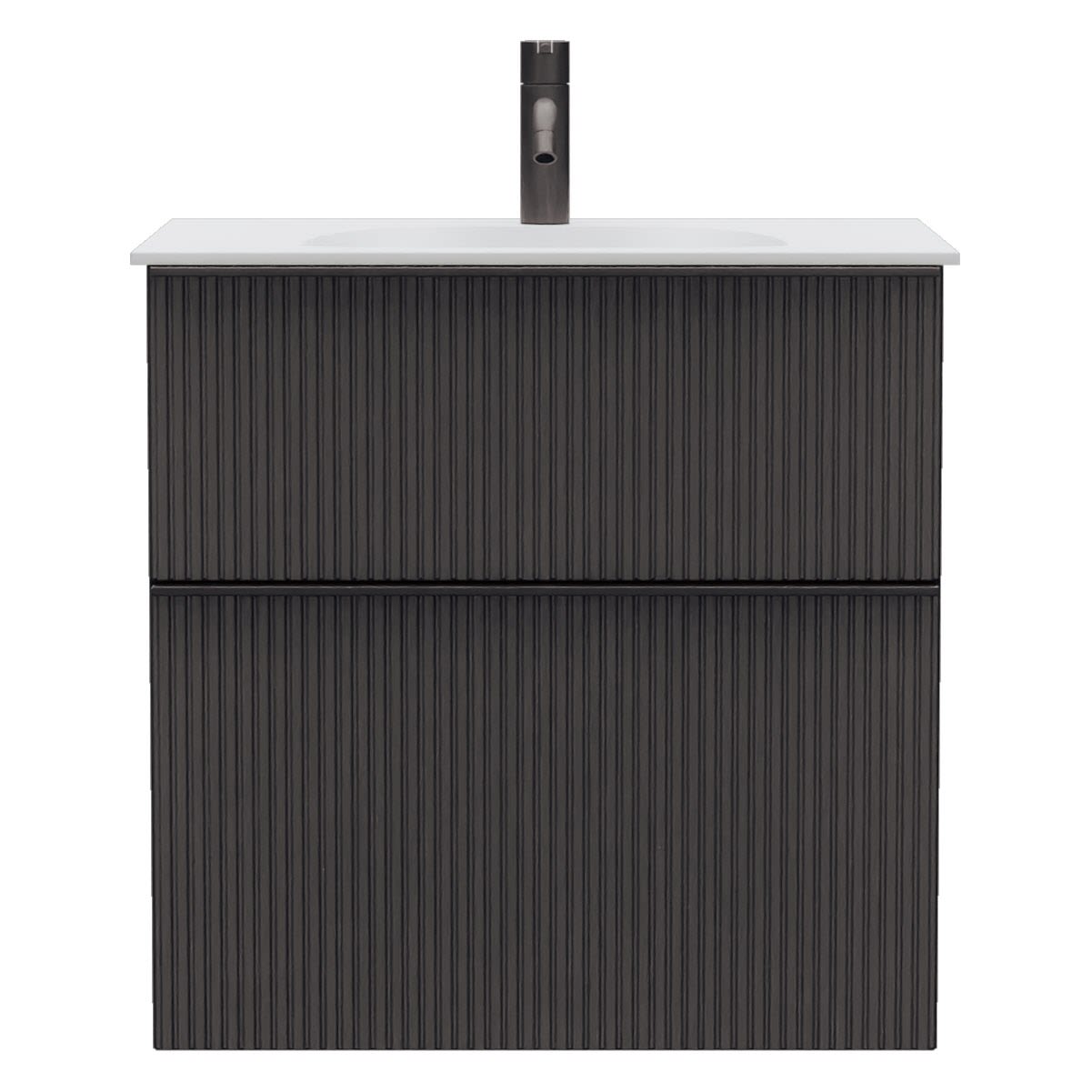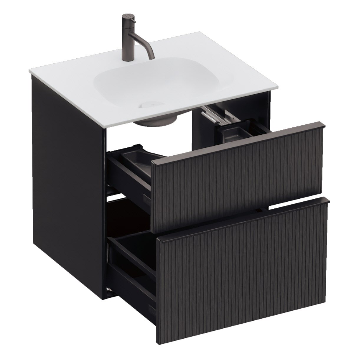 - 1 Schublade oben, 35 cm tief, mit vertikaler Struktur inkl. Siphonausschnitt und Inneneinteilung