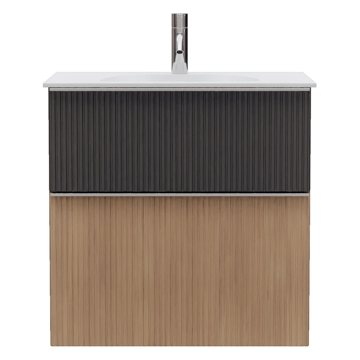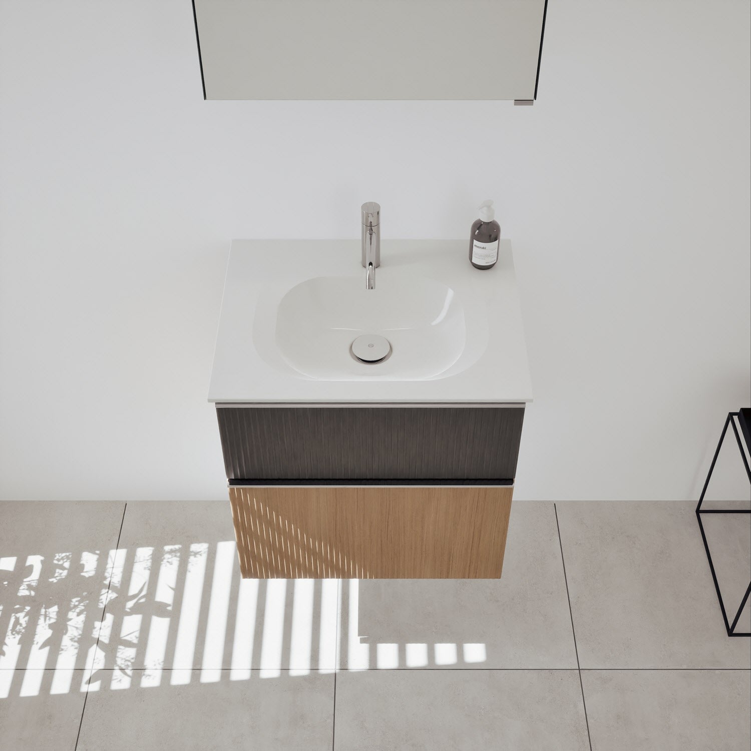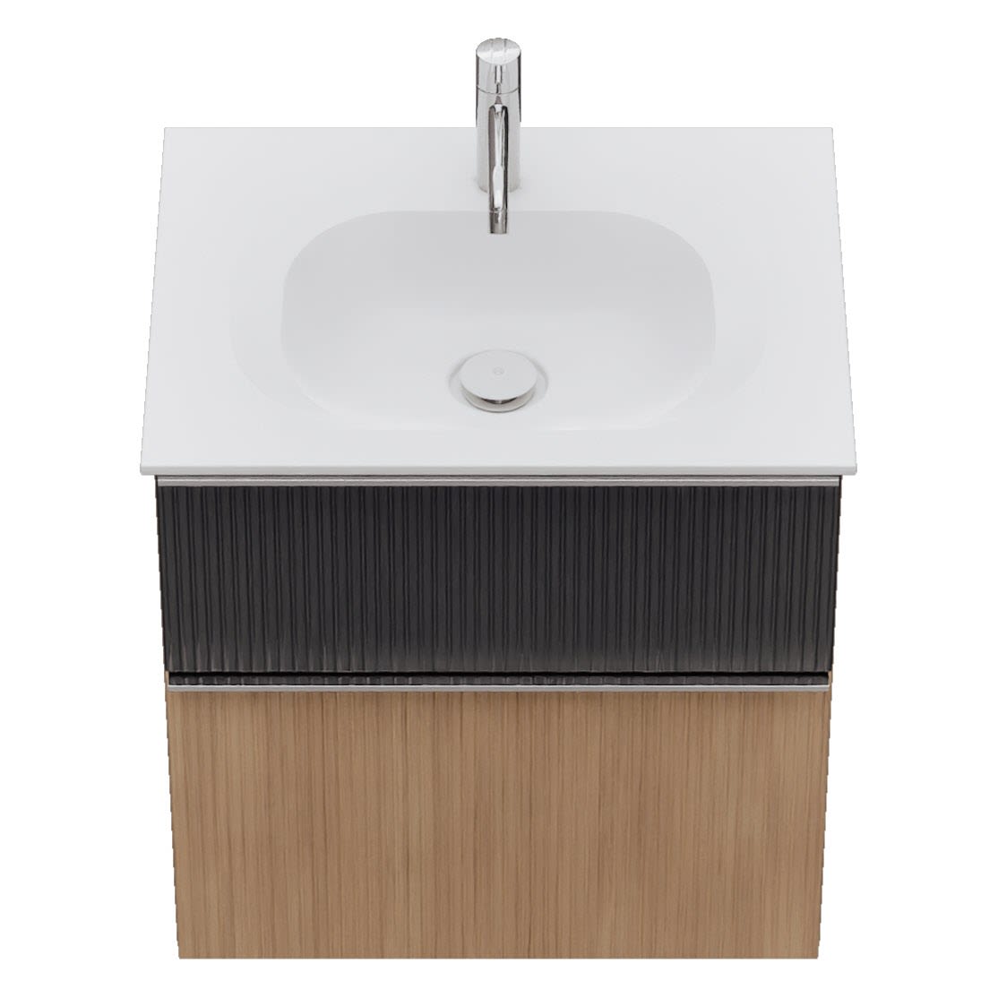 - 1 Schublade oben, 35 cm tief, mit vertikaler Struktur inkl. Siphonausschnitt und Inneneinteilung