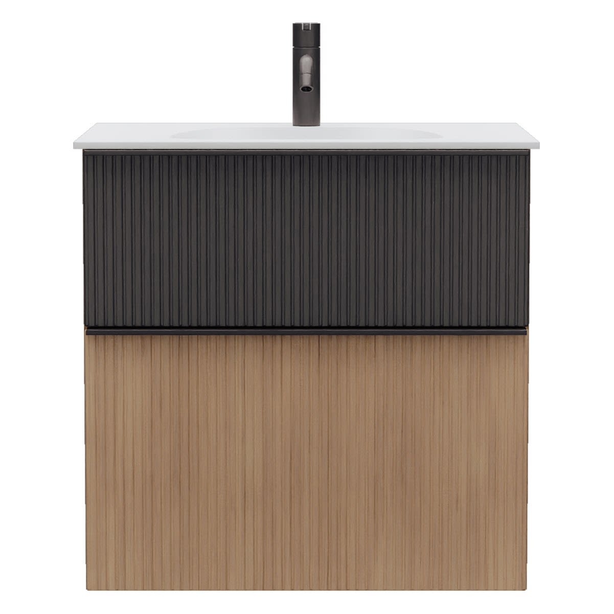 - 1 Schublade oben, 35 cm tief, mit vertikaler Struktur inkl. Siphonausschnitt und Inneneinteilung