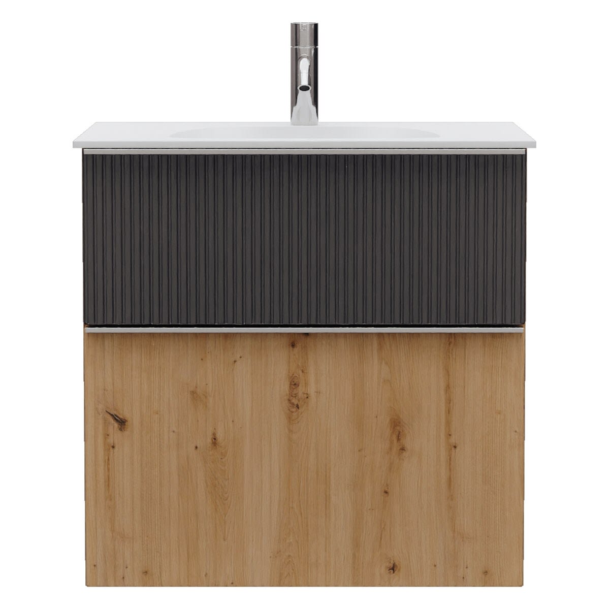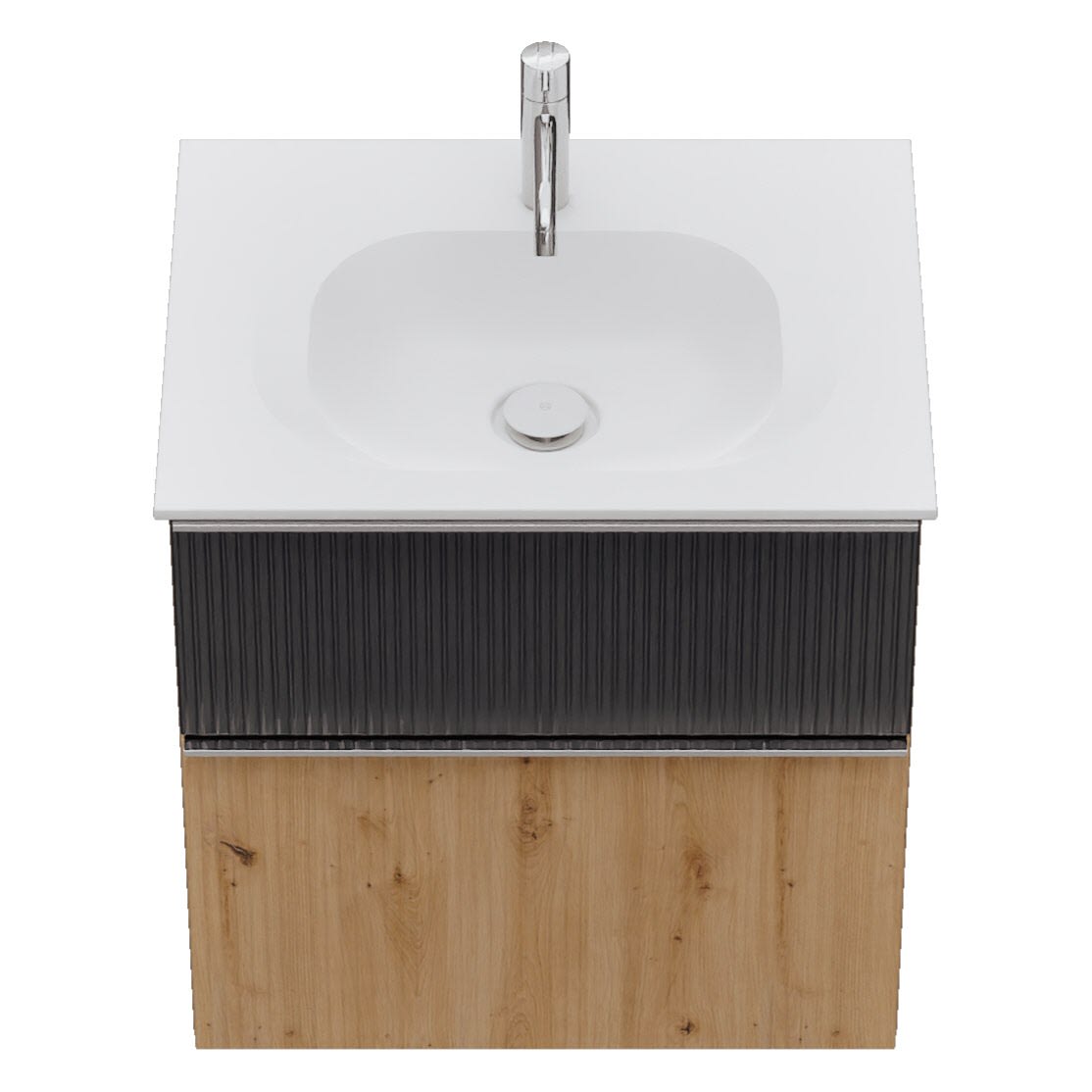 - 1 Schublade oben, 35 cm tief, mit vertikaler Struktur inkl. Siphonausschnitt und Inneneinteilung