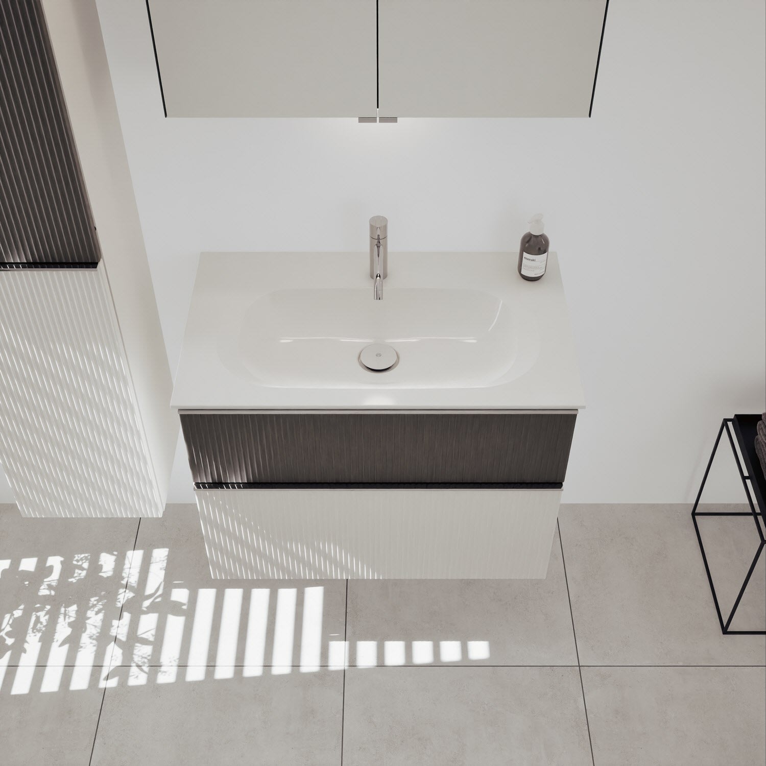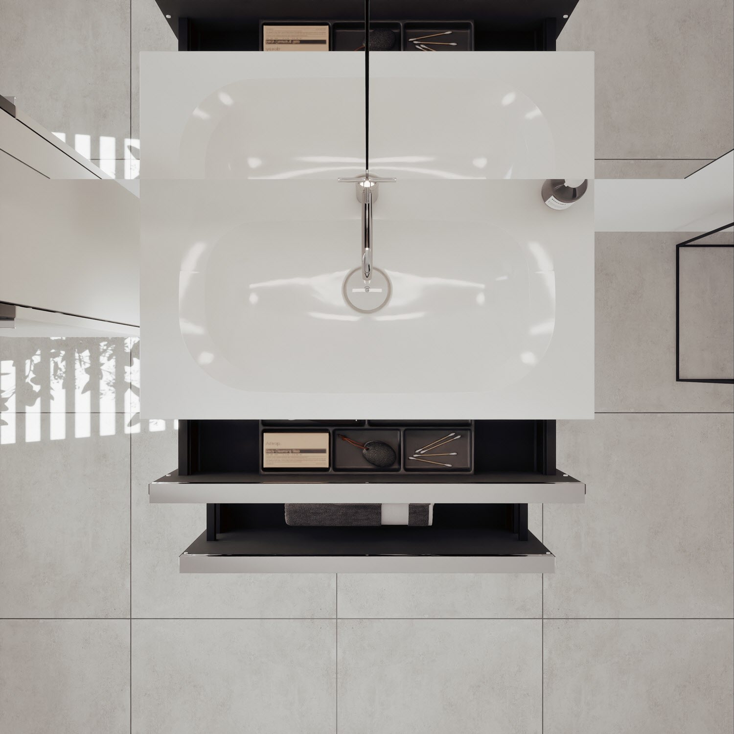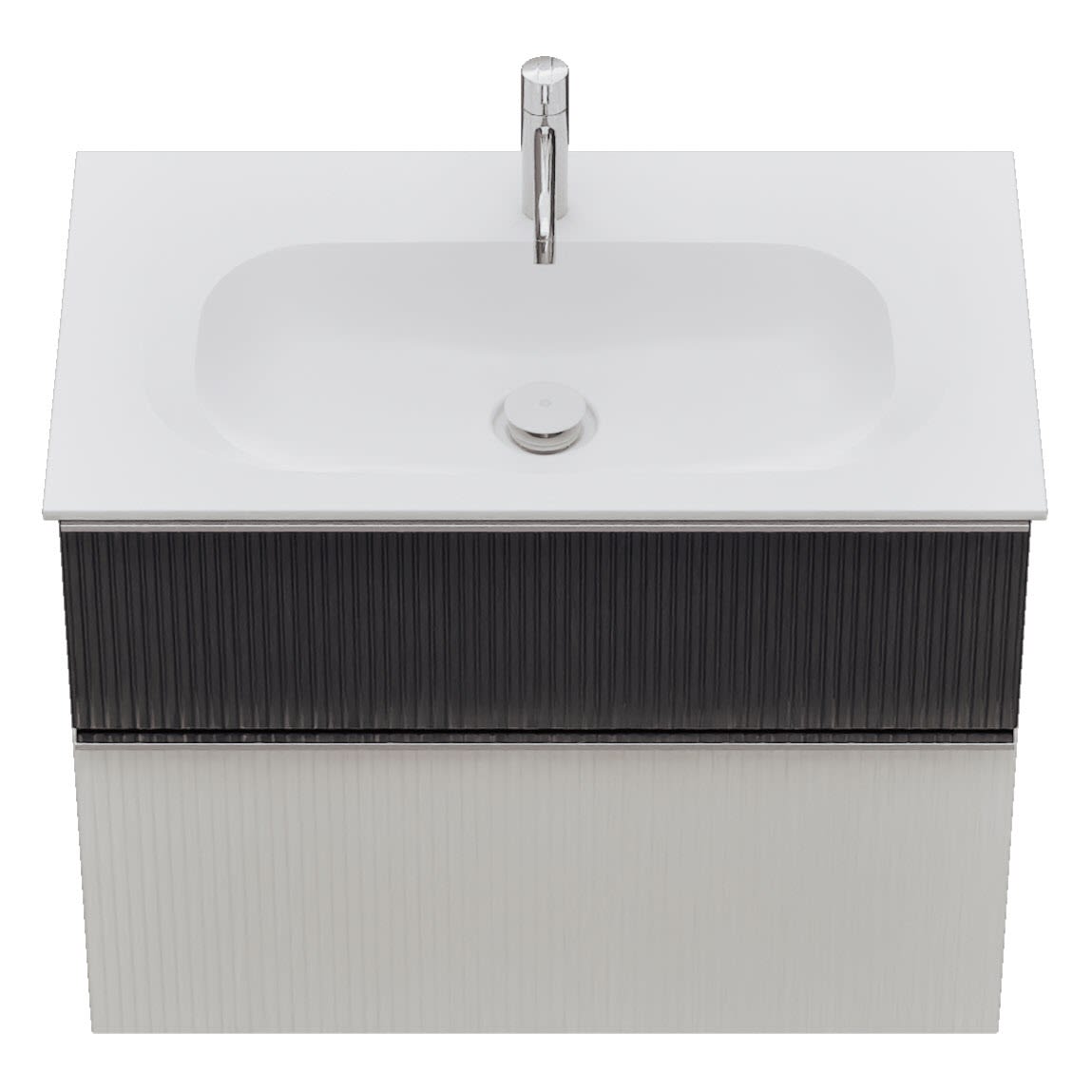 - 1 Schublade oben: 35 cm tief, mit vertikaler Struktur inkl. Siphonausschnitt und Inneneinteilung