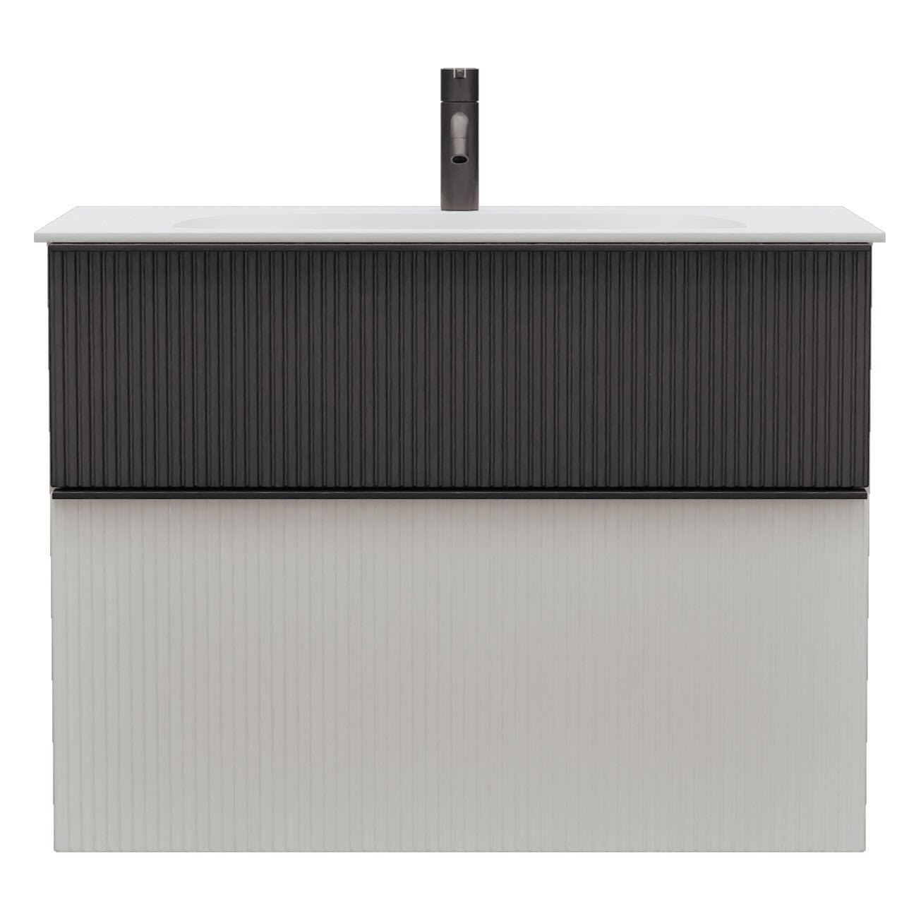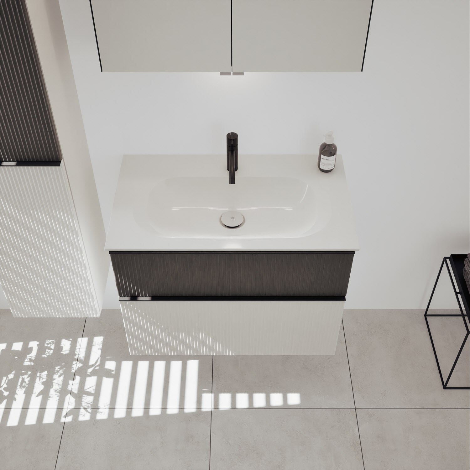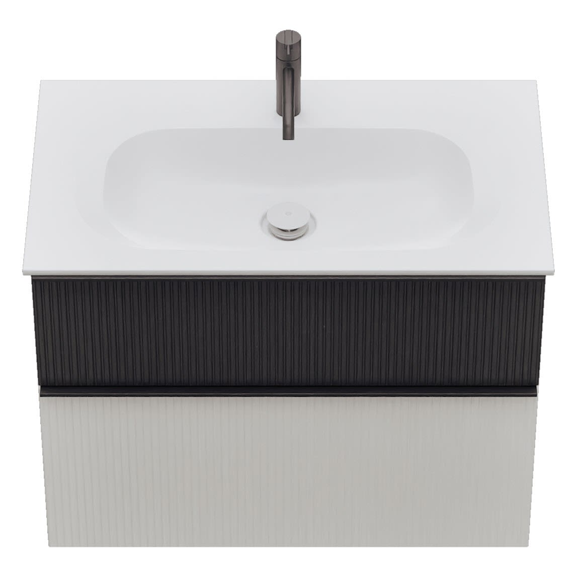 - 1 Schublade oben: 35 cm tief, mit vertikaler Struktur inkl. Siphonausschnitt und Inneneinteilung
