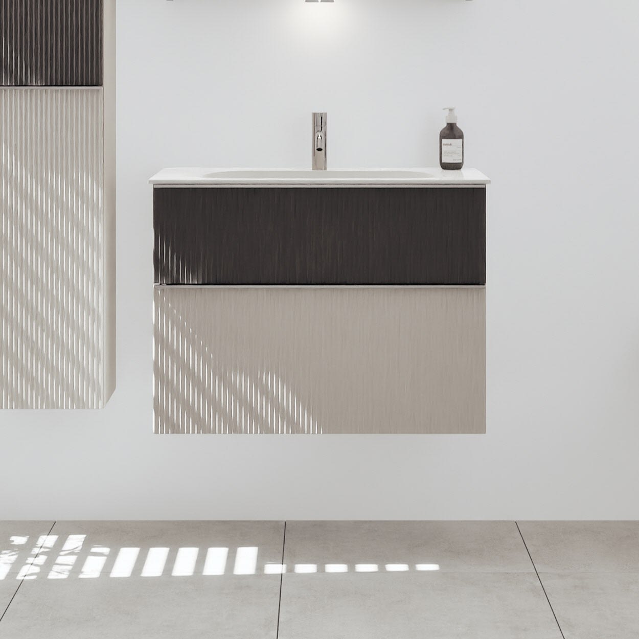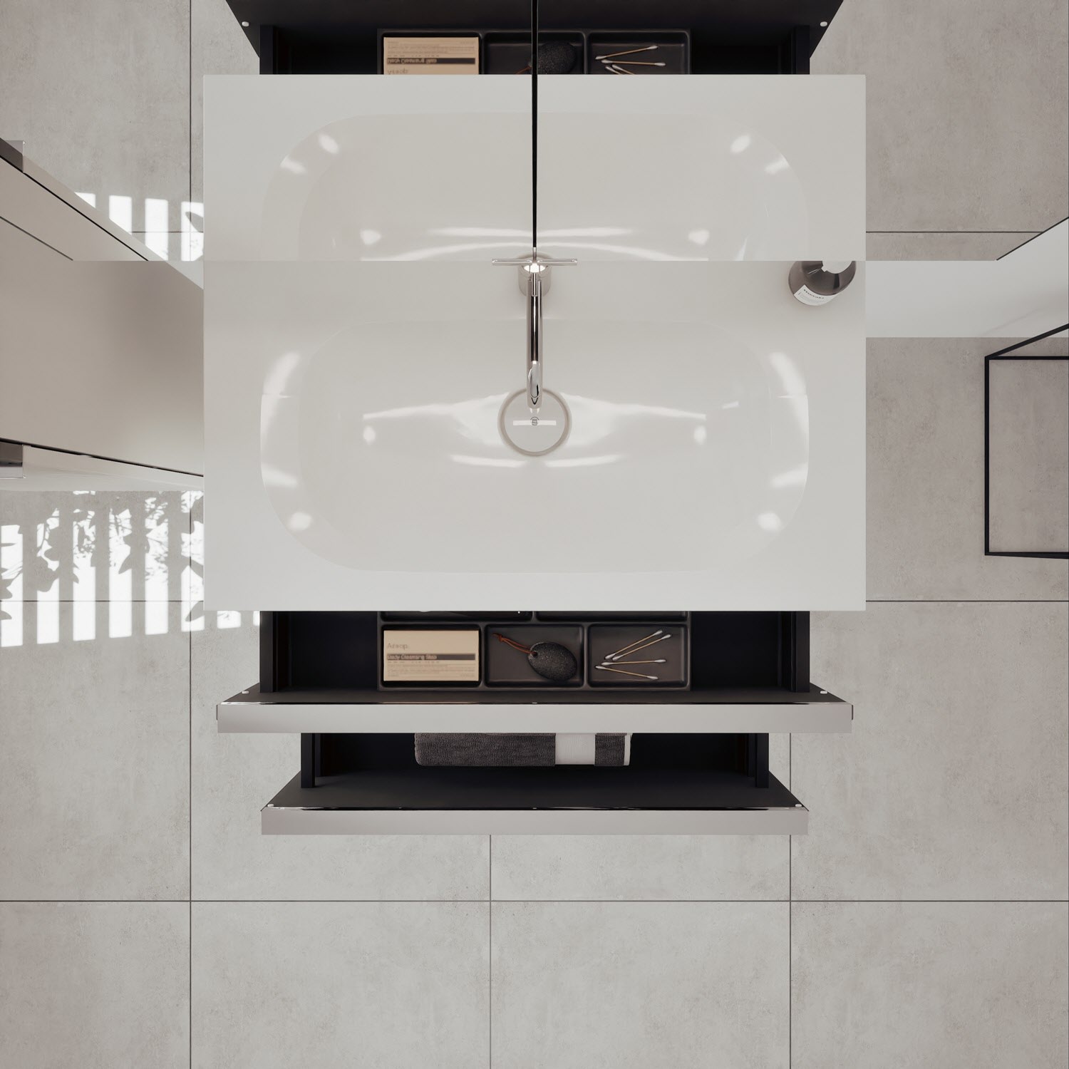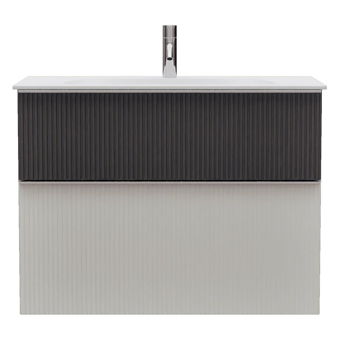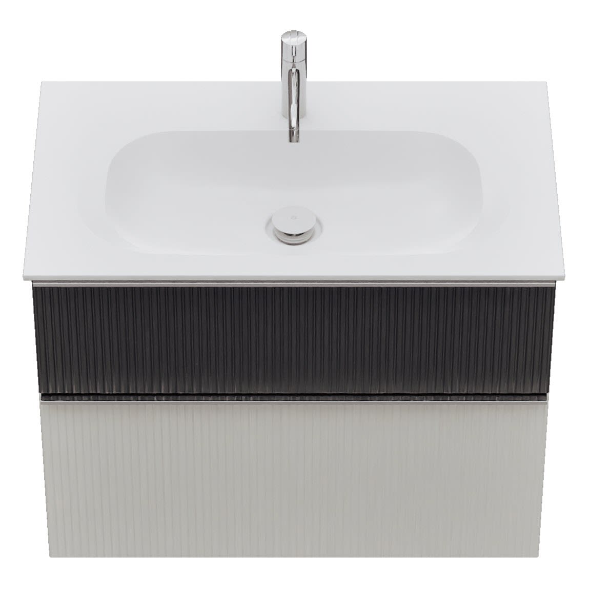 - 1 Schublade oben: 35 cm tief, mit vertikaler Struktur inkl. Siphonausschnitt und Inneneinteilung