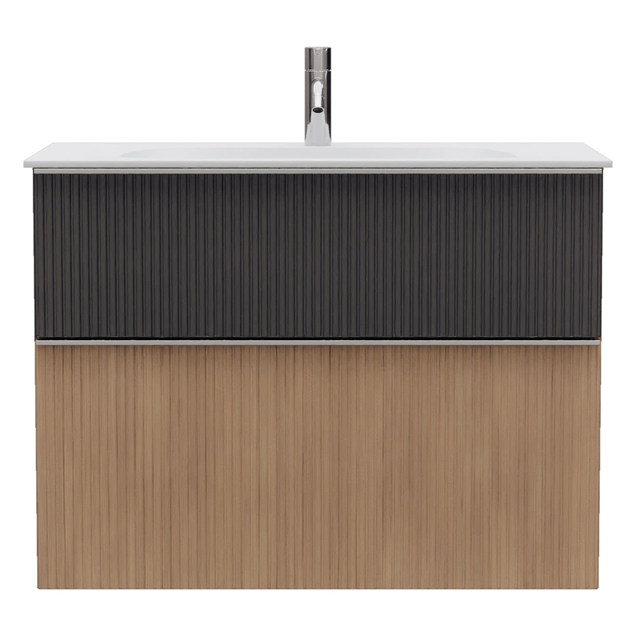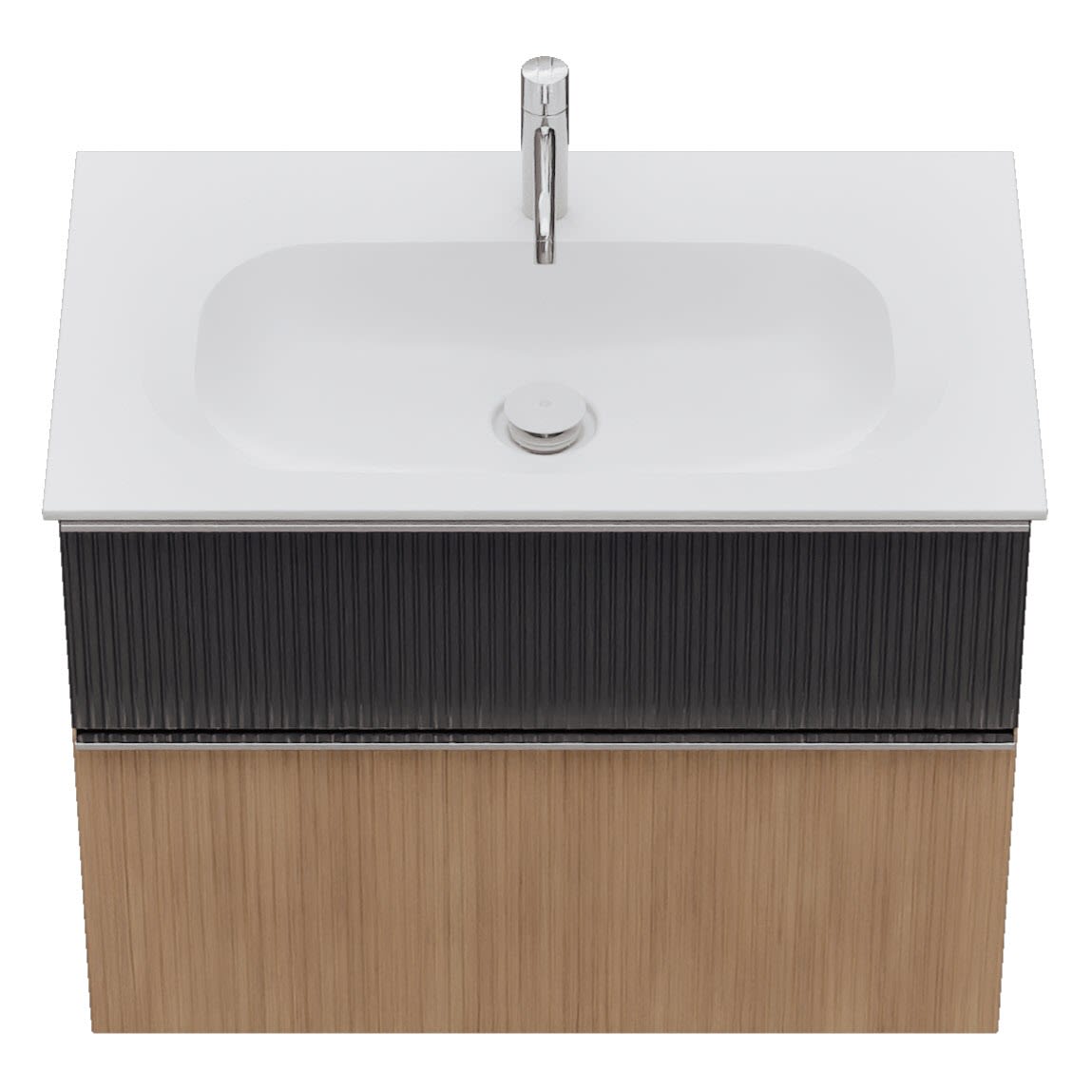 - 1 Schublade oben: 35 cm tief, mit vertikaler Struktur inkl. Siphonausschnitt und Inneneinteilung