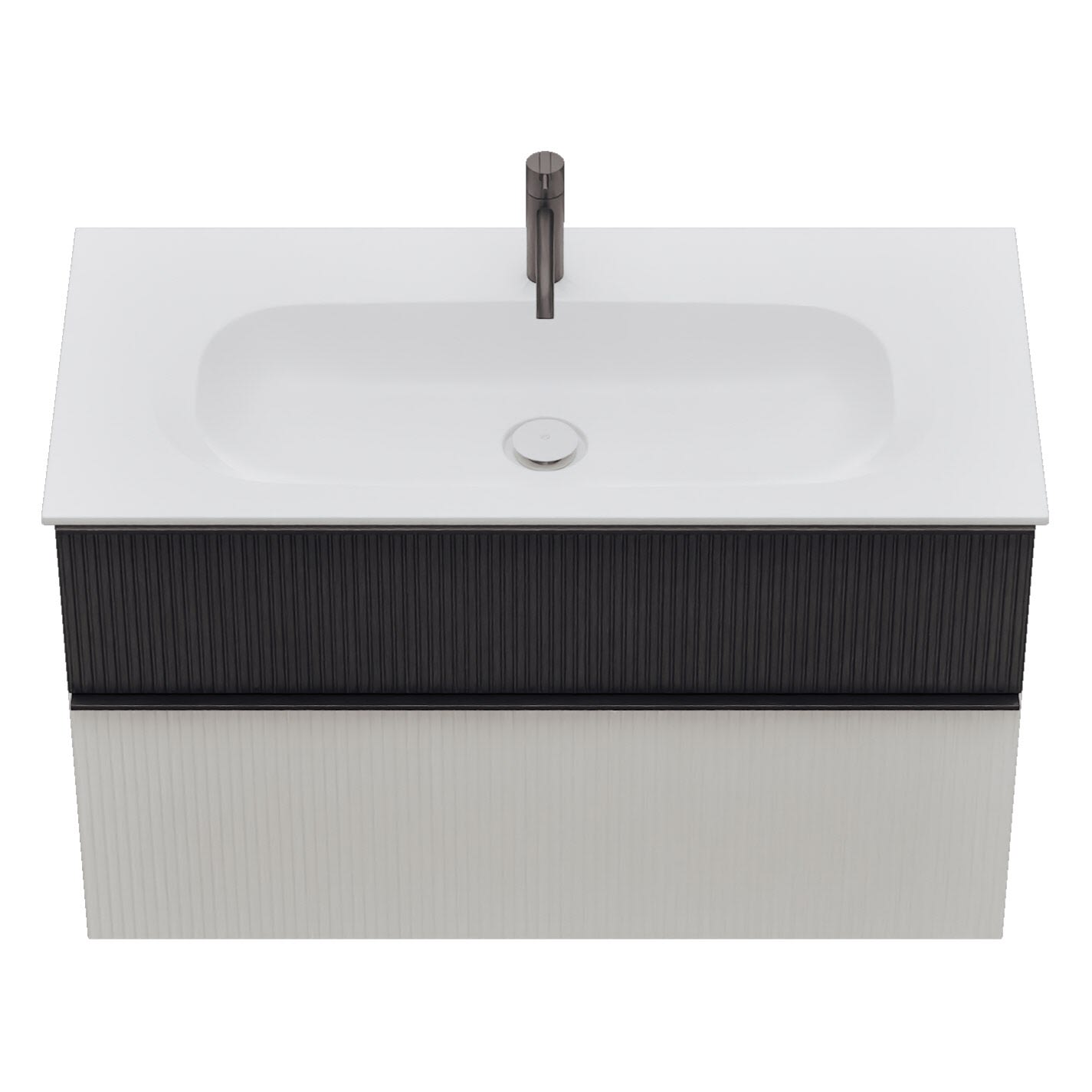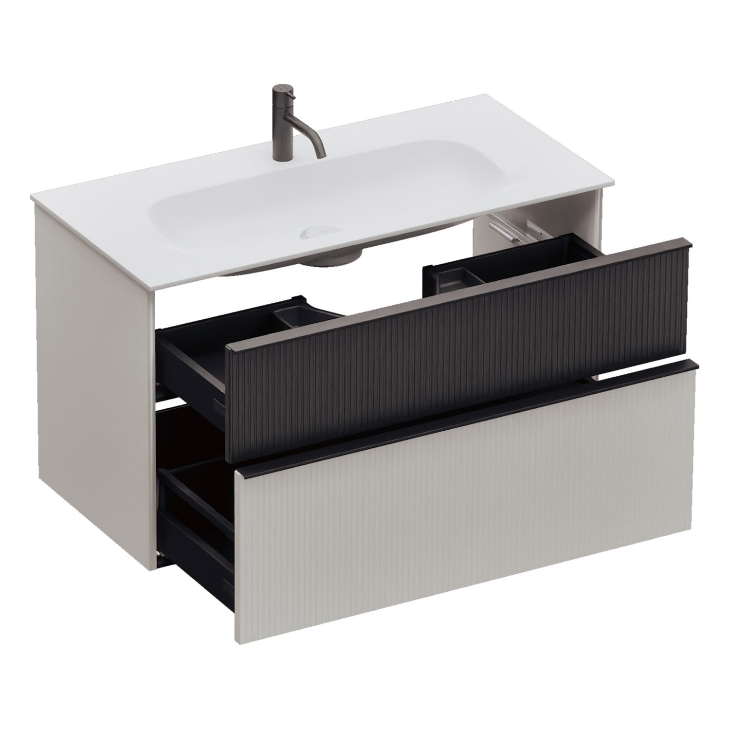 - 1 Schublade oben, 35 cm tief, mit vertikaler Struktur inkl. Siphonausschnitt und Inneneinteilung