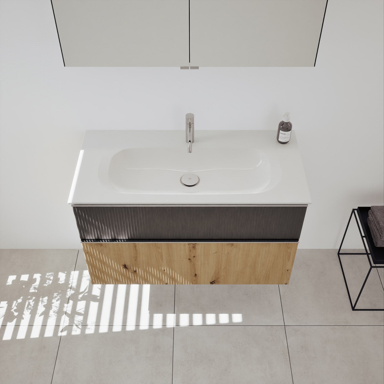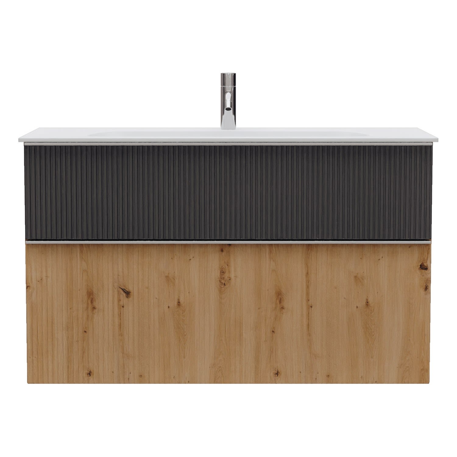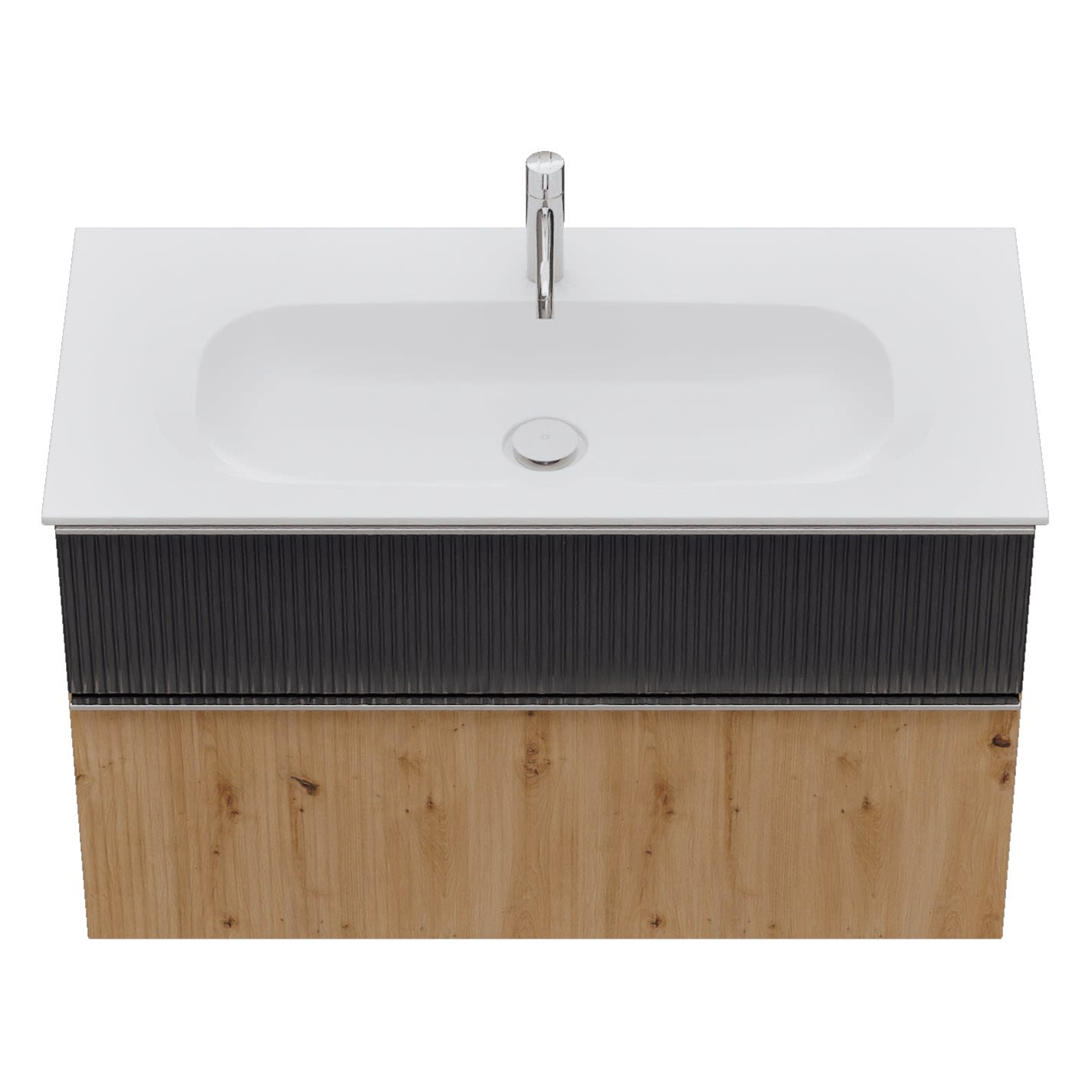 - 1 Schublade oben, 35 cm tief, mit vertikaler Struktur inkl. Siphonausschnitt und Inneneinteilung