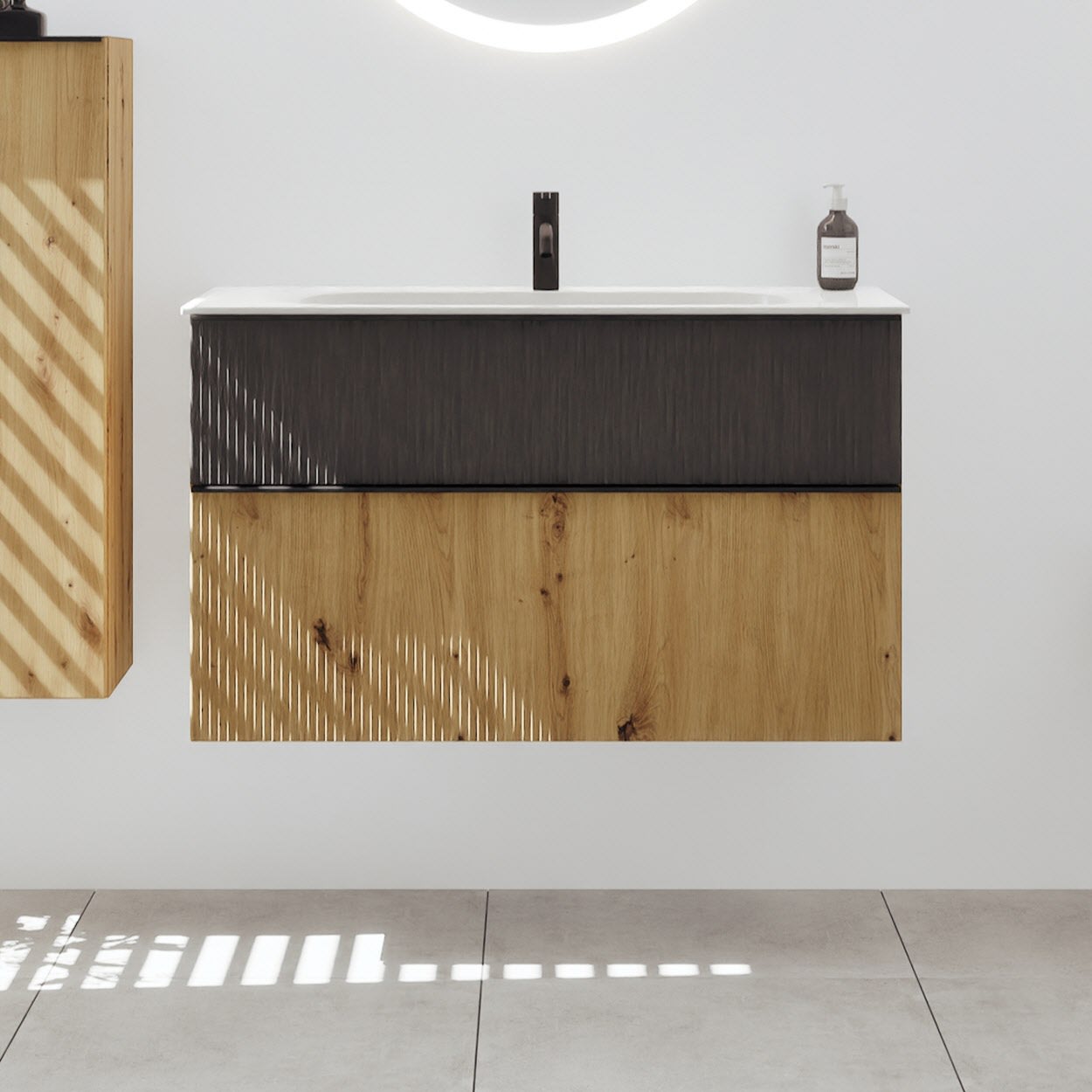 - 1 Schublade oben, 35 cm tief, mit vertikaler Struktur inkl. Siphonausschnitt und Inneneinteilung