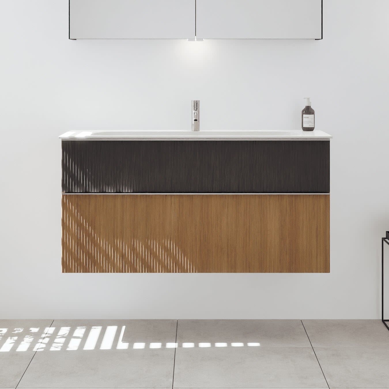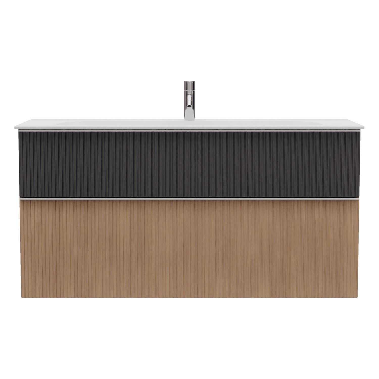 - 1 Schublade oben, 35 cm tief, mit vertikaler Struktur inkl. Siphonausschnitt und Inneneinteilung