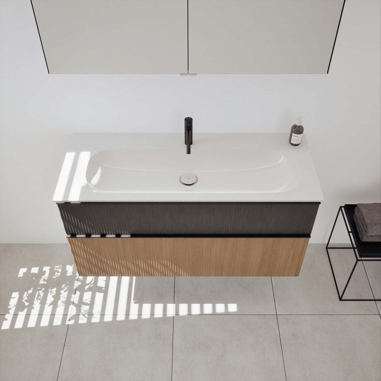 - 1 Schublade oben, 35 cm tief, mit vertikaler Struktur inkl. Siphonausschnitt und Inneneinteilung