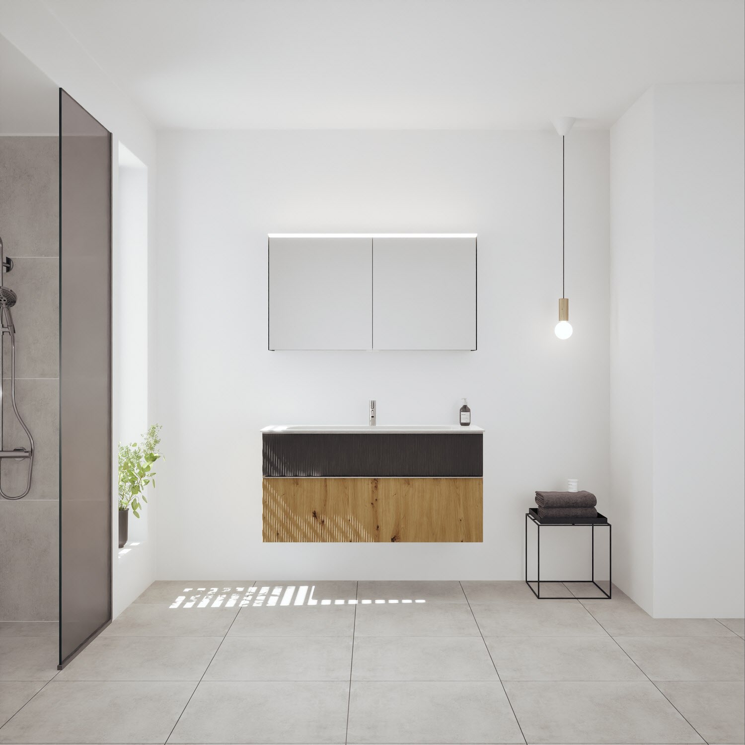 burgbad Fiumo 2.0 Spiegelschrank 120,6 cm mit LED-Aufsatzleuchte und Waschplatzbeleuchtung, 2 Spiegeltüren