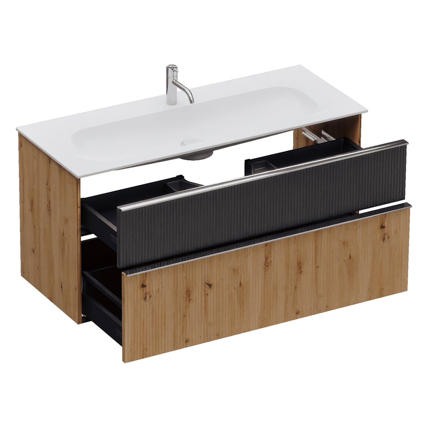 - 1 Schublade oben, 35 cm tief, mit vertikaler Struktur inkl. Siphonausschnitt und Inneneinteilung