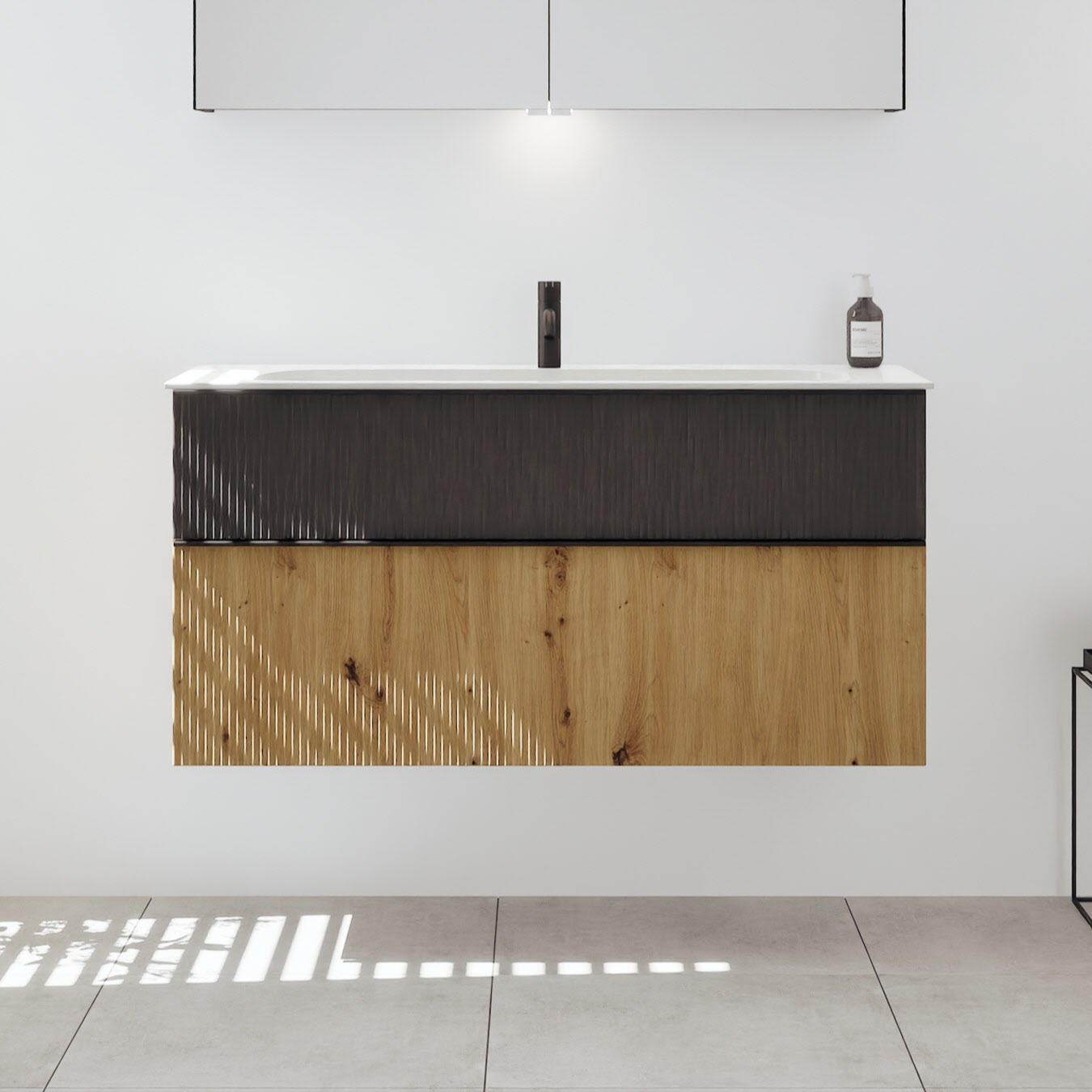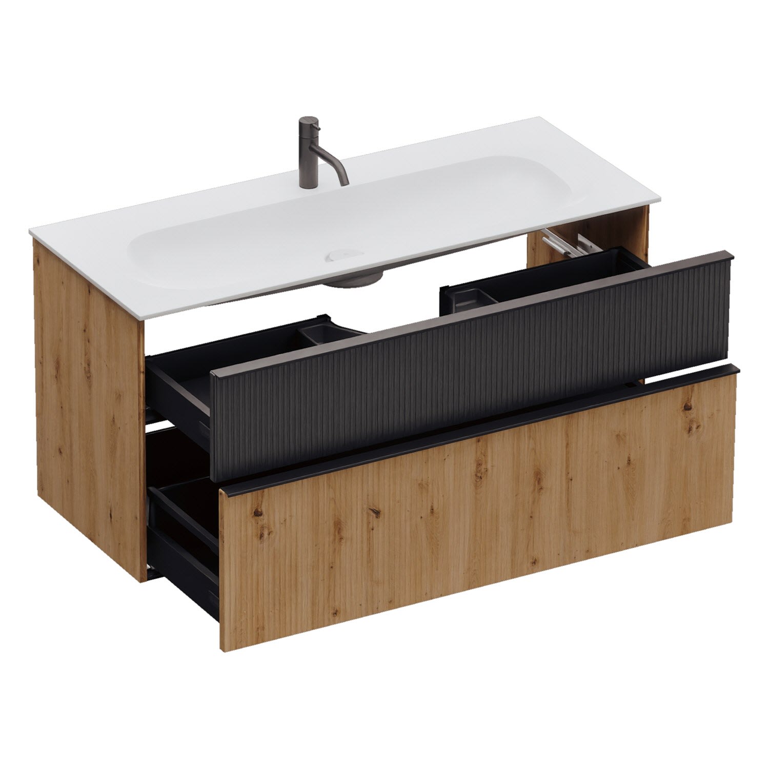- 1 Schublade oben, 35 cm tief, mit vertikaler Struktur inkl. Siphonausschnitt und Inneneinteilung