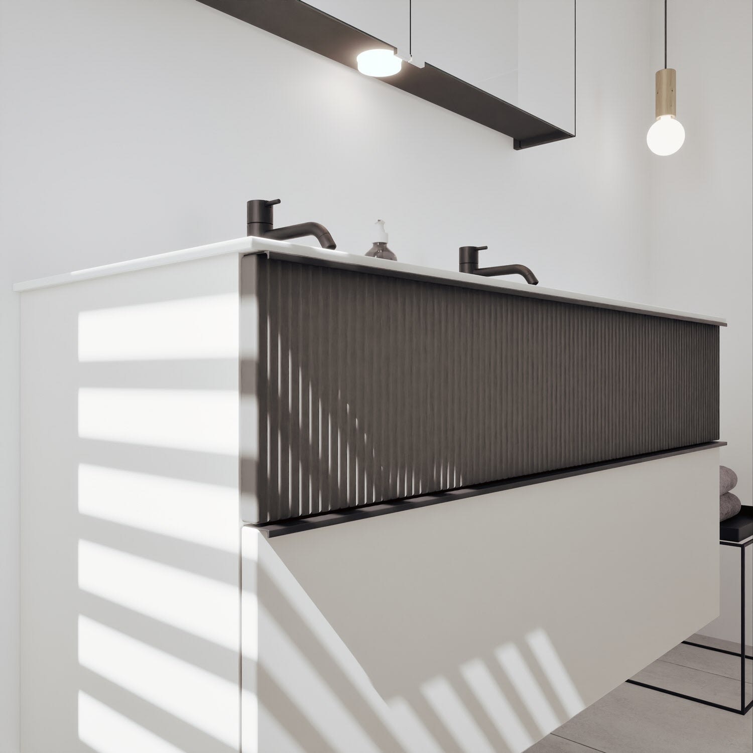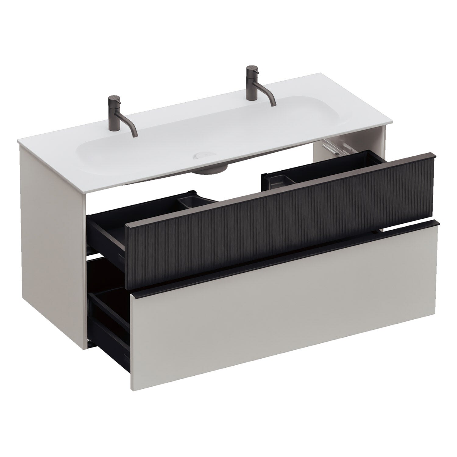 - 1 Schublade oben: 35 cm tief, mit vertikaler Struktur inkl. Siphonausschnitt und Inneneinteilung