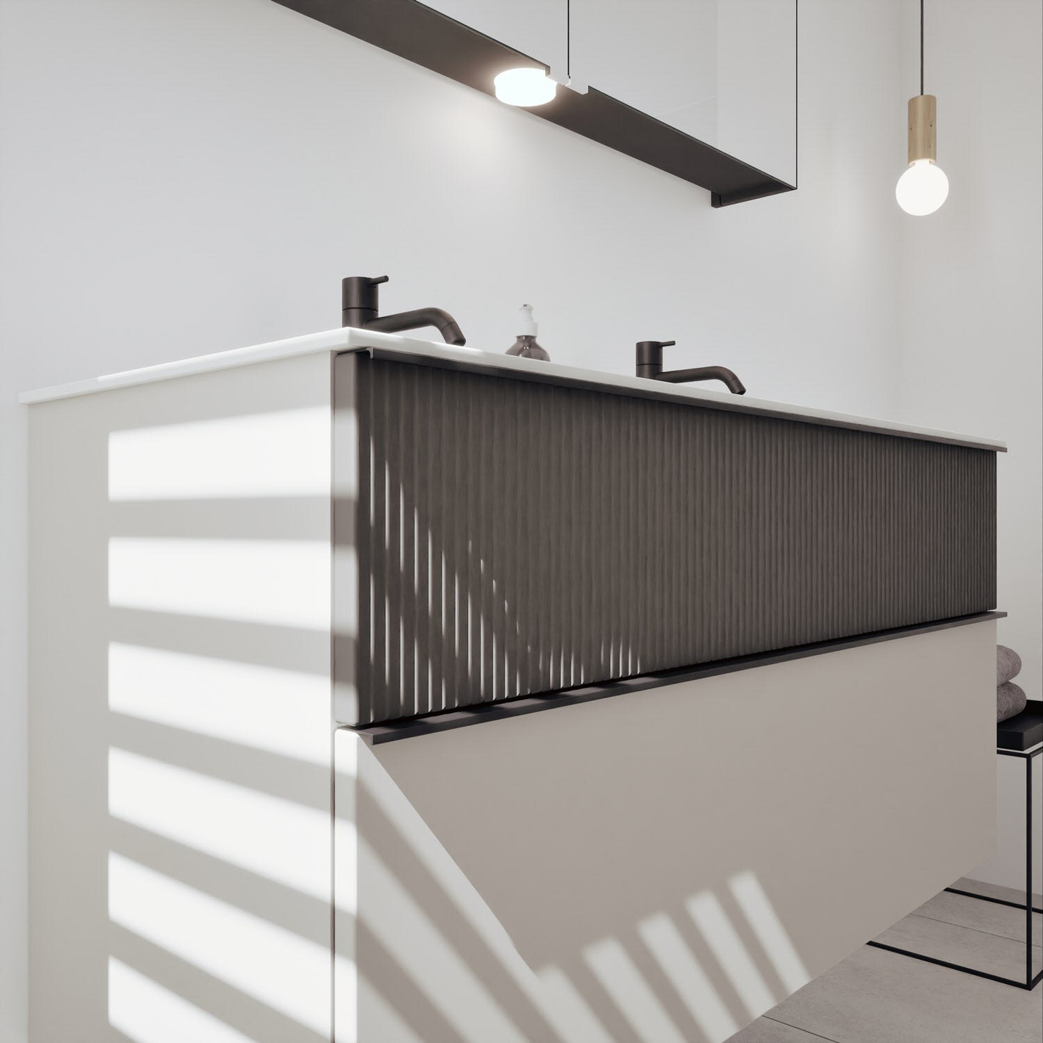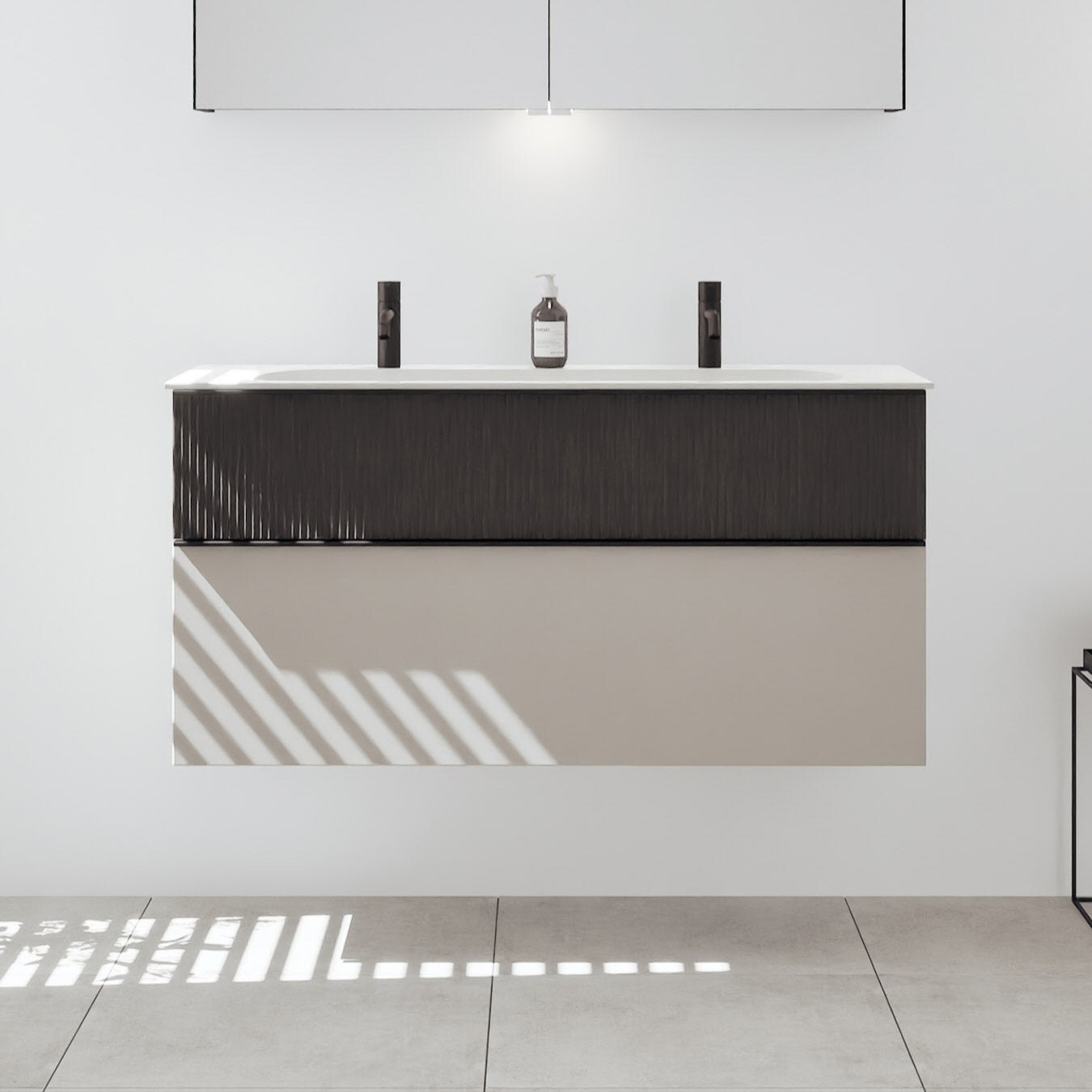 - 1 Schublade oben: 35 cm tief, mit vertikaler Struktur inkl. Siphonausschnitt und Inneneinteilung