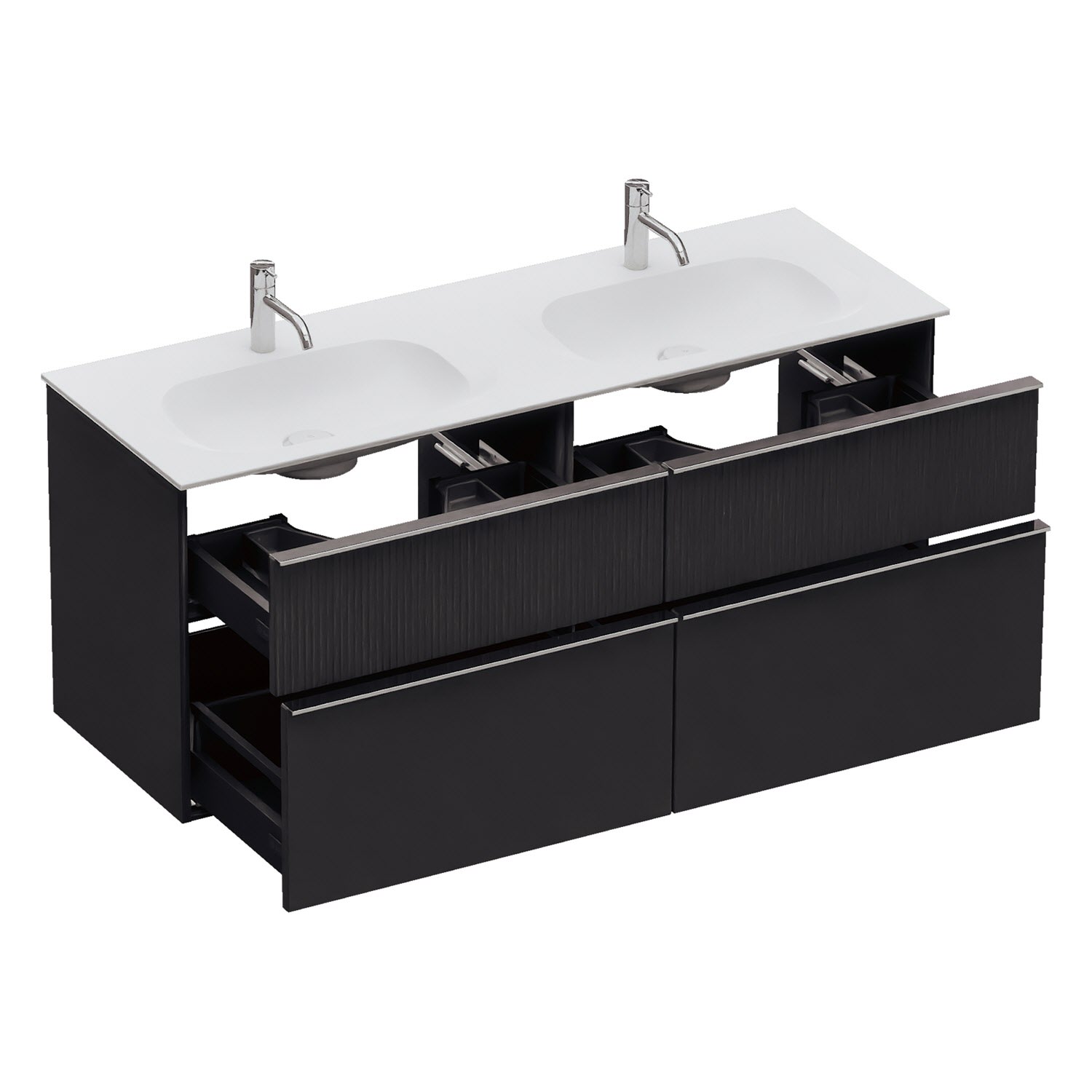 - 2 Schubladen oben, 35 cm tief, mit Siphonausschnitt und Inneneinteilung