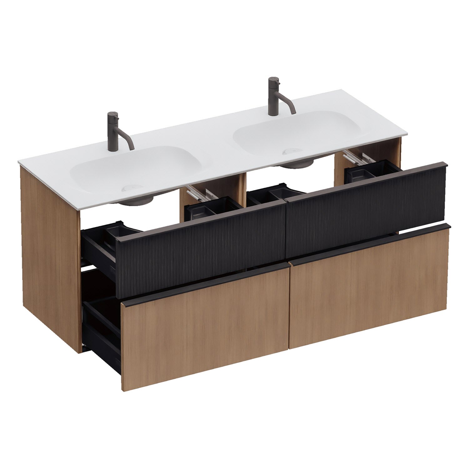 - 2 Schubladen oben, 35 cm tief, mit Siphonausschnitt und Inneneinteilung