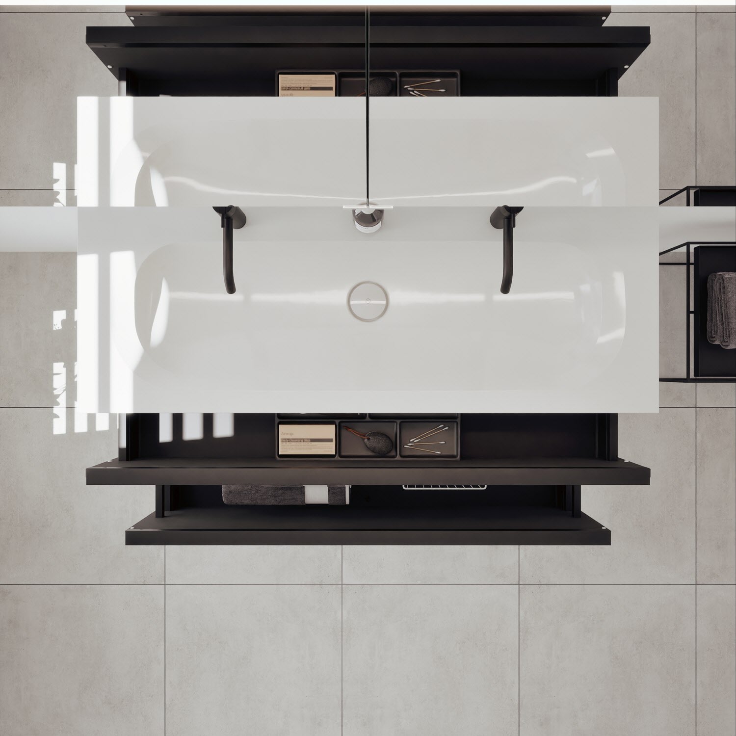 - 1 Schublade oben: 35 cm tief, mit vertikaler Struktur inkl. Siphonausschnitt und Inneneinteilung