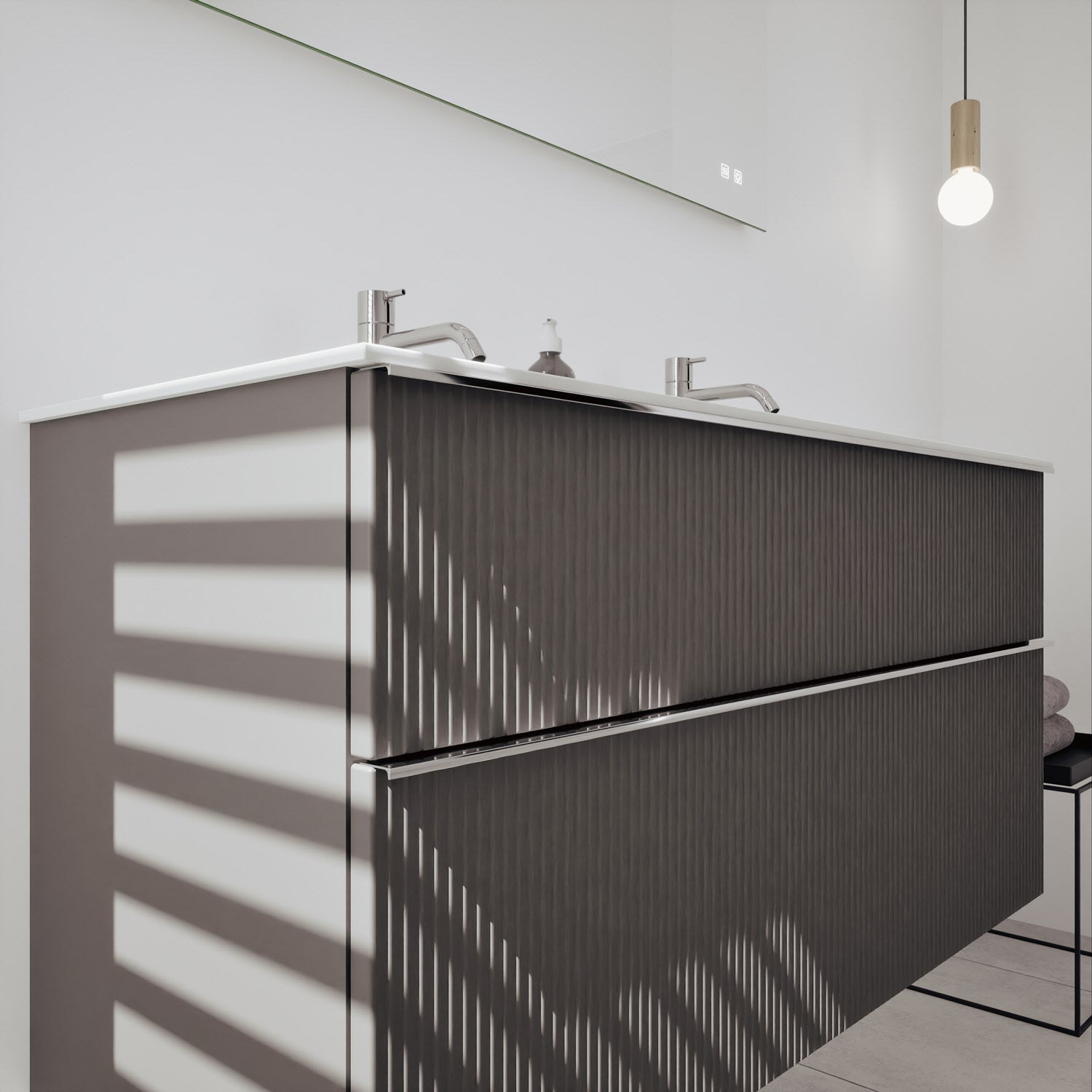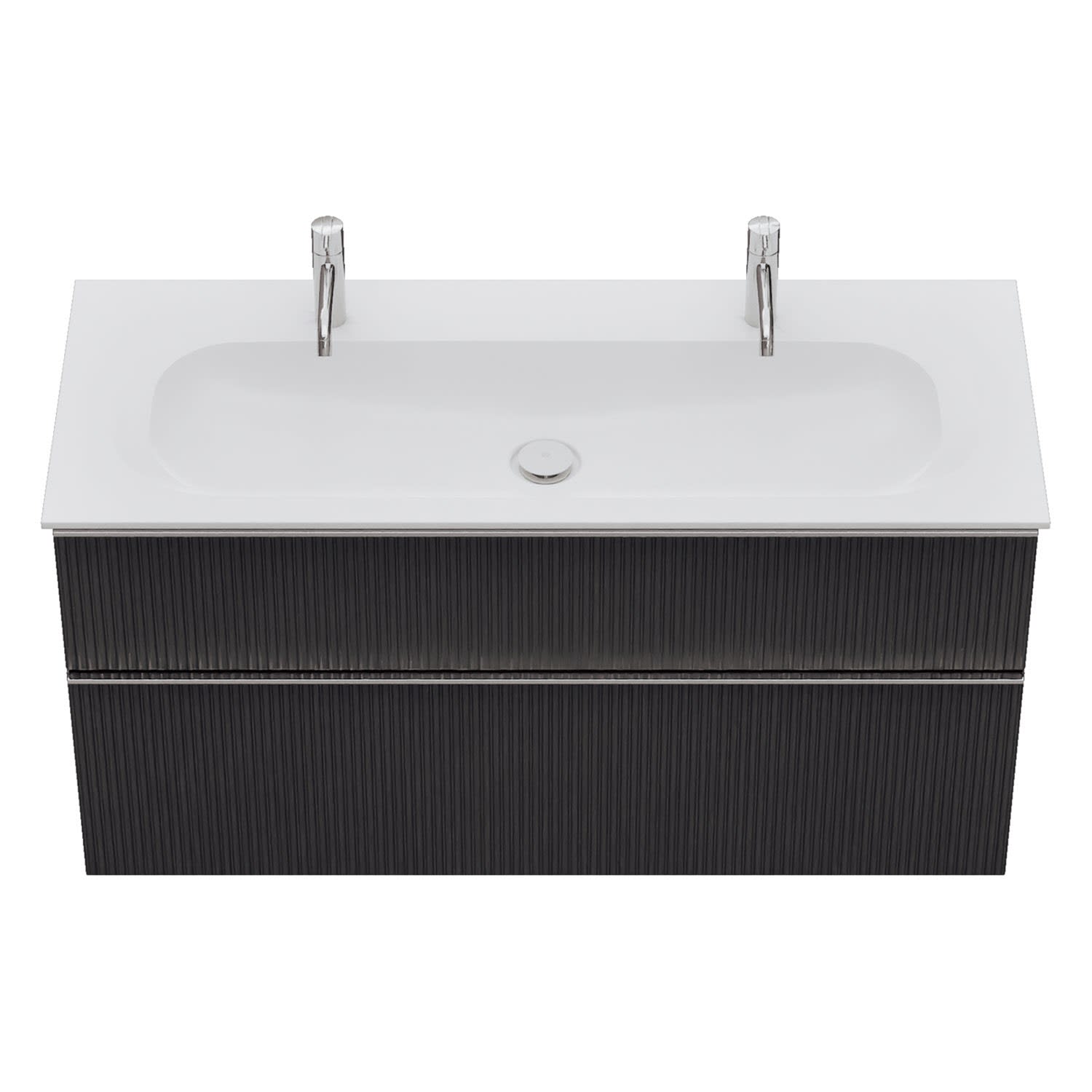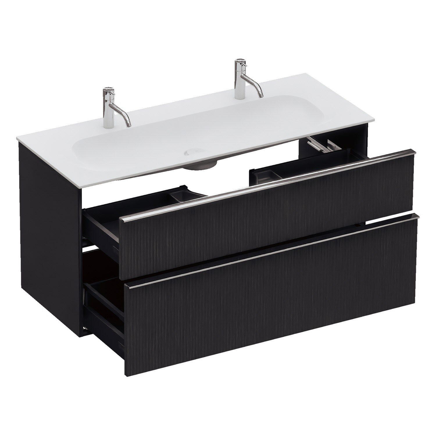 - 1 Schublade oben: 35 cm tief, mit vertikaler Struktur inkl. Siphonausschnitt und Inneneinteilung