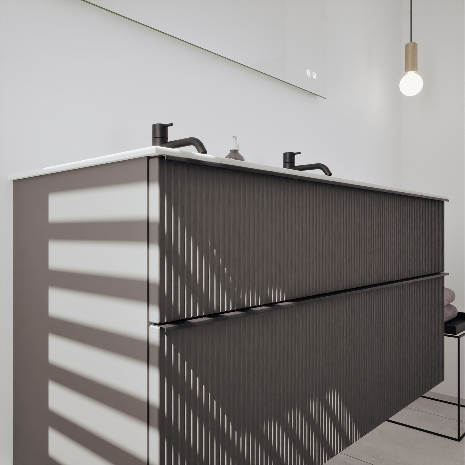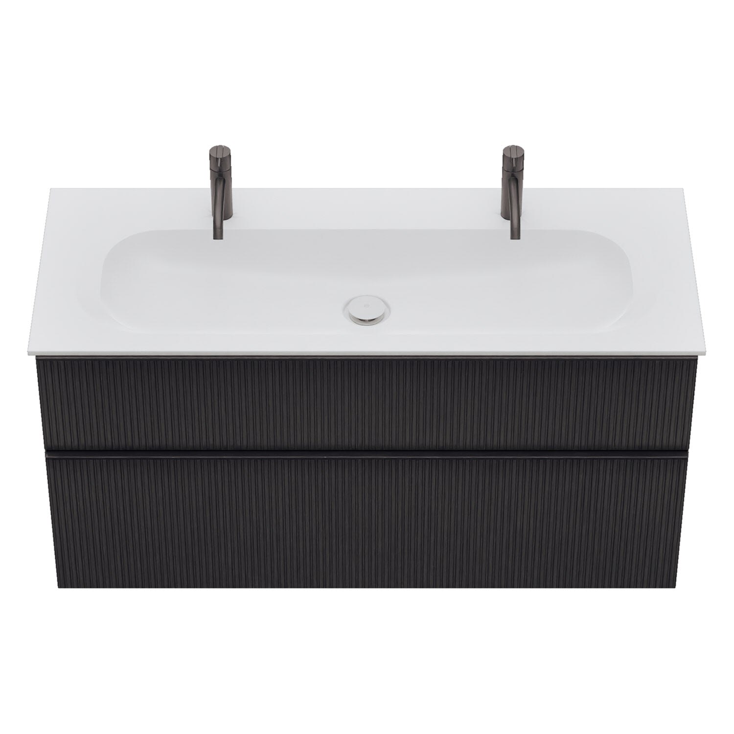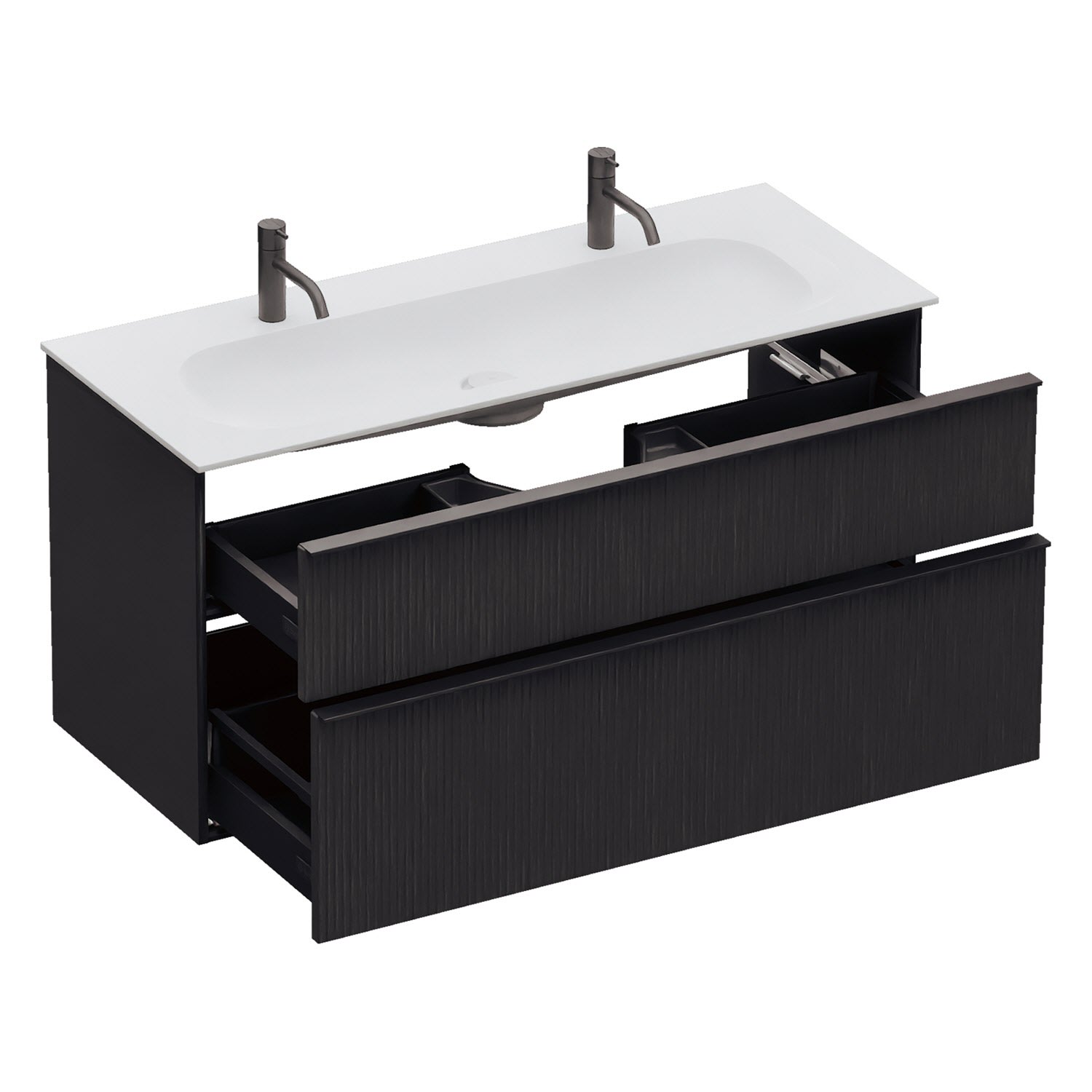 - 1 Schublade oben: 35 cm tief, mit vertikaler Struktur inkl. Siphonausschnitt und Inneneinteilung